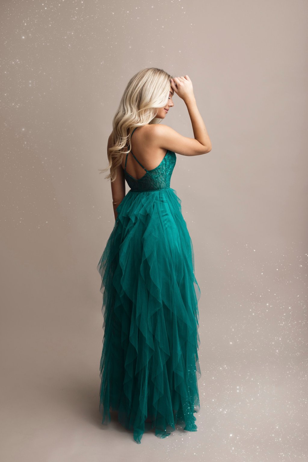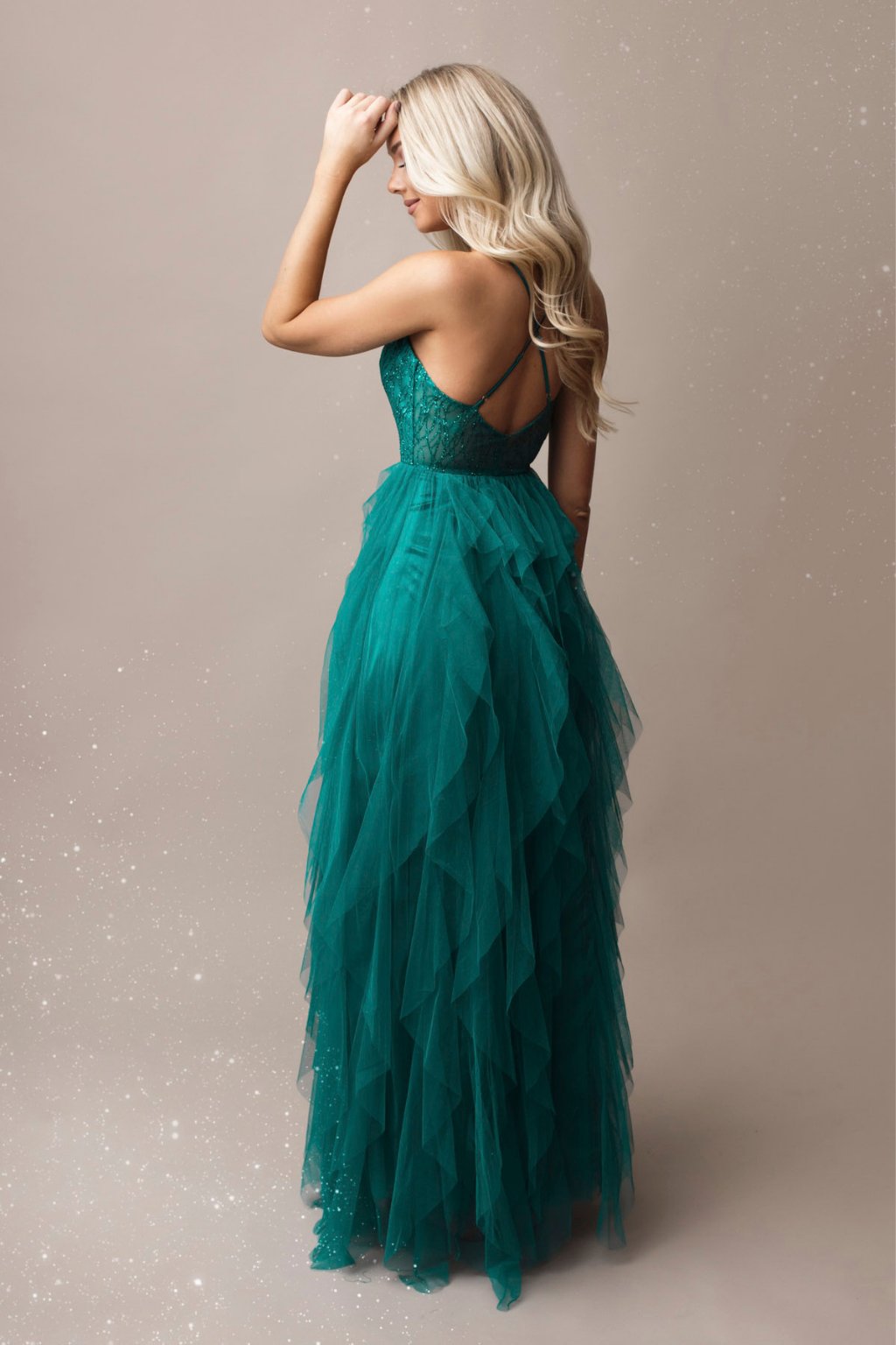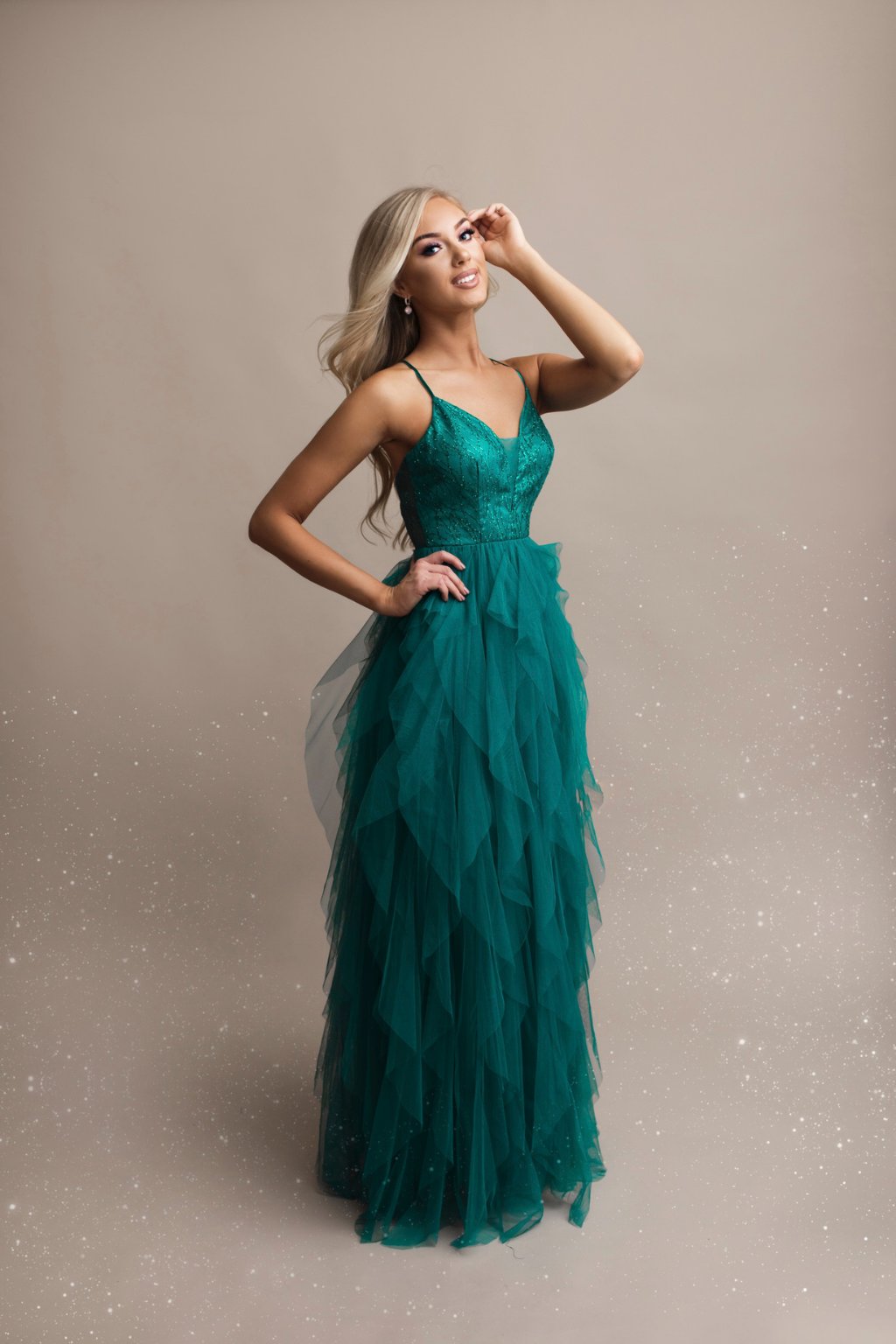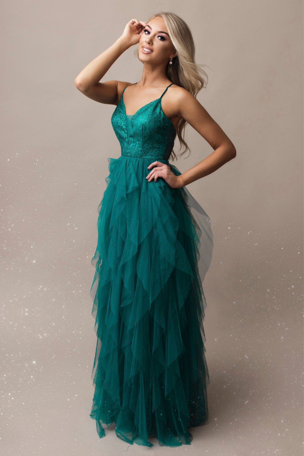 Královnou večera? V těchto šatech to jinak ani nemůže být. Výjimečná barva, třpytivé flitry a nadýchaná tylová sukně - souhra, která dělá tyto šaty dokonalými. I vás tak uchvátili? Materiál šatů není elastický, na boční straně se zapínají zipem a na prsou jsou vyztuženy. P>