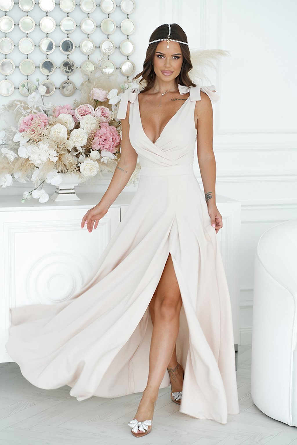 Něžnost, ženskost, jemnost – slova, která vystihují tyto krásné šaty s roztomilými mašličkami na ramenou. Materiál šatů je mírně elastický a vzadu se zapínají zipem.