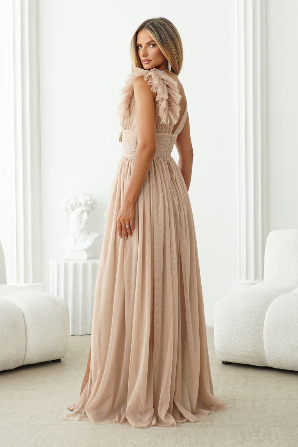 V těchto šatech zajisté učarujete každému pohledu. Výrazný tyl na rameni a rozparek, který odhalí krok zpoza nadýchaného tylu se postarají o elegantní, noblesní a smyslný vzhled.