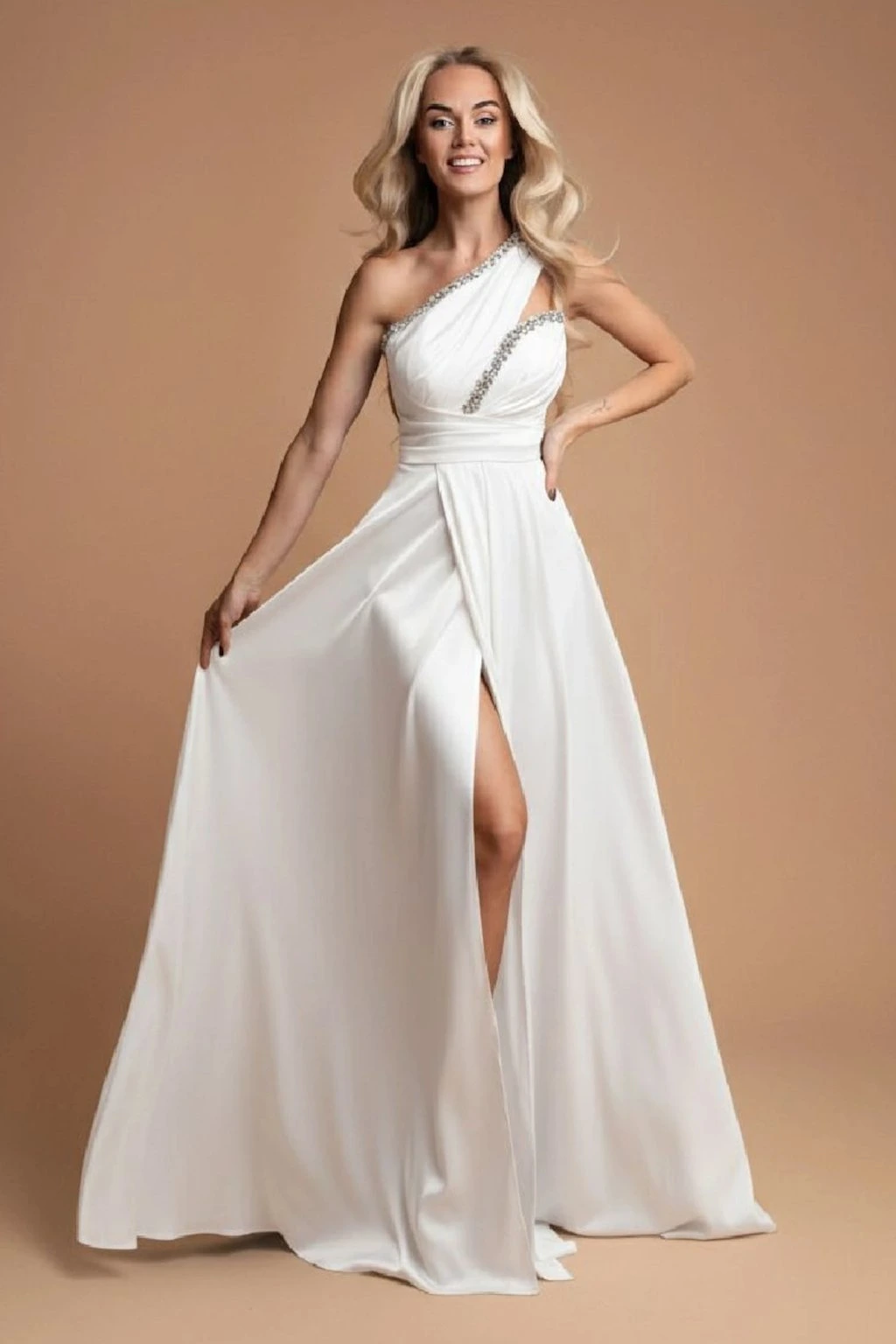 Luxusní svatební šaty, které okamžitě upoutají pozornost. Splývavá sukně s rozparkem dodává modelu jemnou dávku svůdnosti, přičemž celkový dojem zůstává elegantní a sofistikovaný. Ideální volba pro nevěstu, která touží po elegantním a nezapomenutelném vzhledu ve svůj velký den. Šaty jsou na prsou vyztužené a vzadu se zapínají zipem.