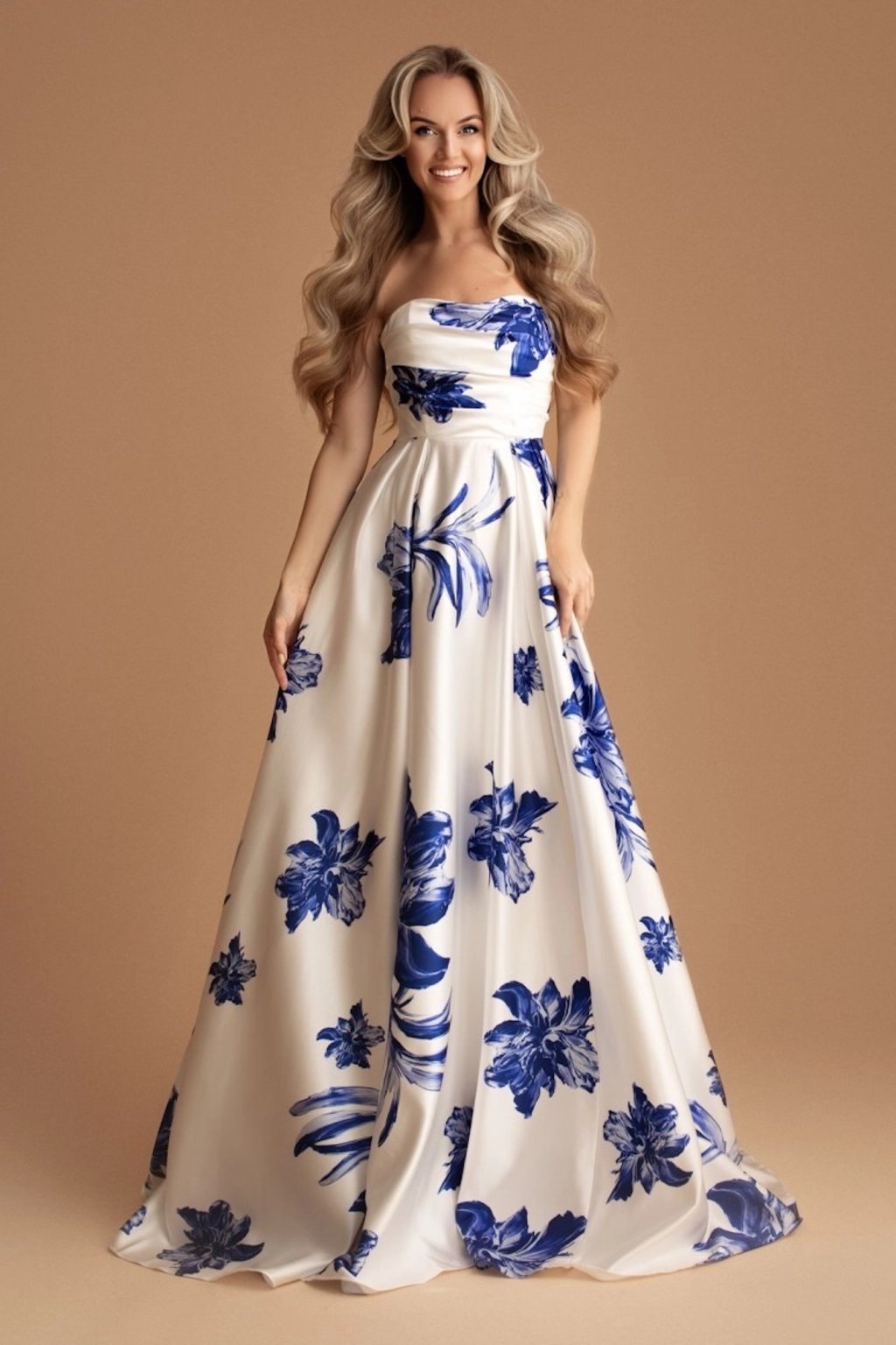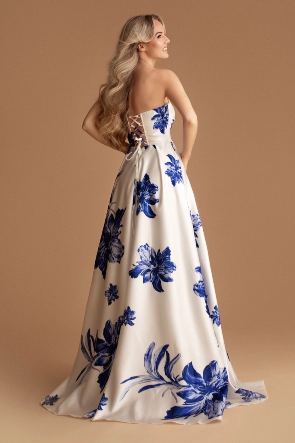 Jak z pohádky, tyto šaty se nesou na vlnách jemnosti a ladnosti. Každý pohyb v nich se mění v půvabný tanec a působivý květinový vzor dodává šatům svěžest a šarm. Ideální pro letní svatbu, garden party či společenskou událost pod širým nebem. Šaty jsou na prsou vyztužené a jejich součástí jsou odnímatelná ramínka.