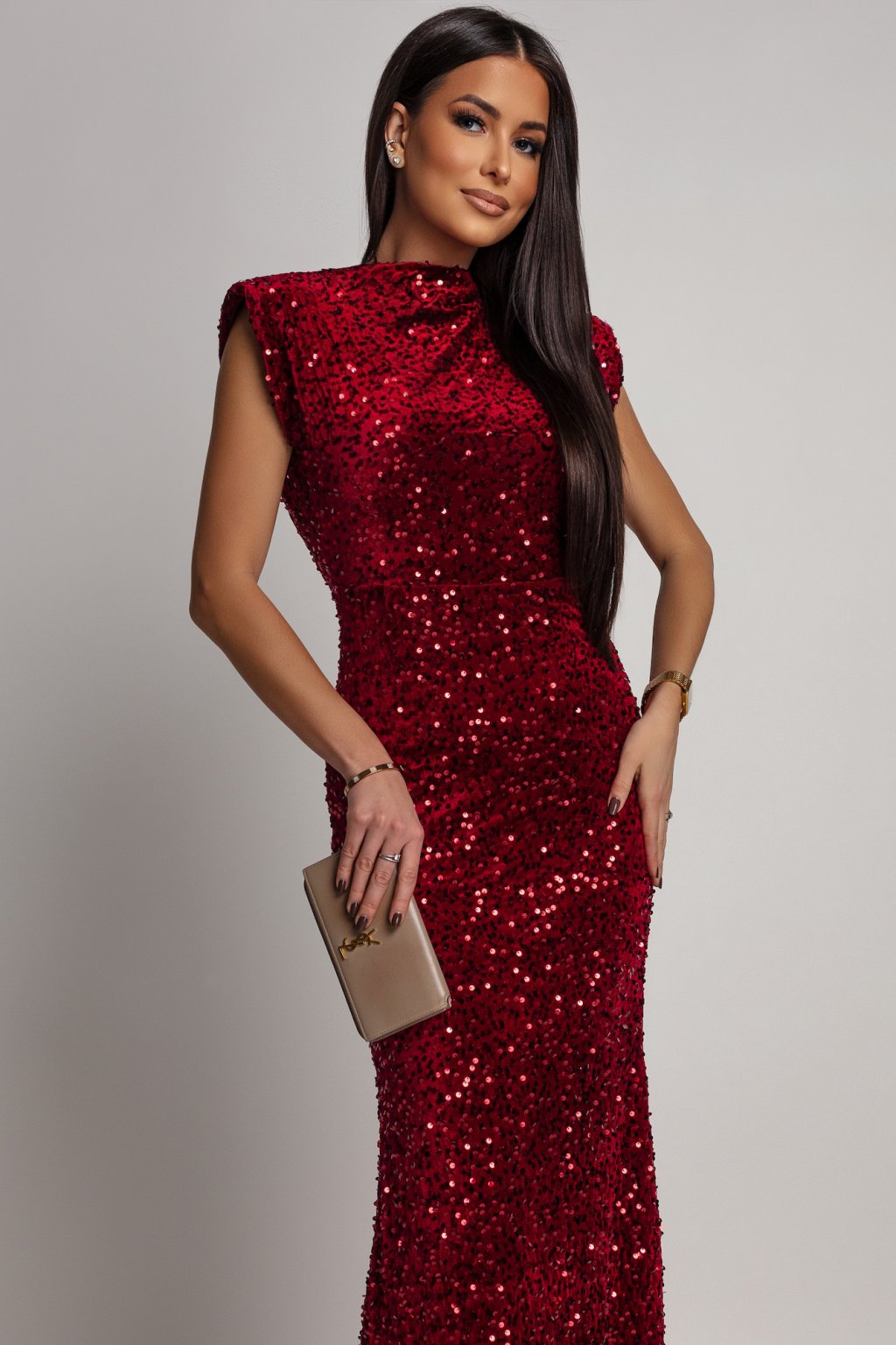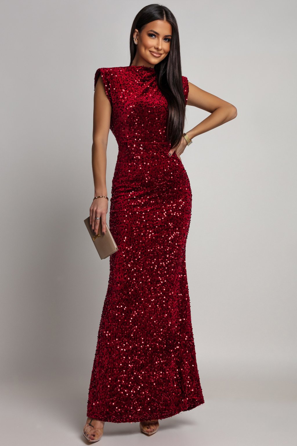 Šaty, které spojují luxusní lesk s rafinovanou svůdností. Dlouhý střih krásně prodlužuje siluetu a odhalená záda dodávají celému looku dramatický a elegantní nádech. Dokonalé na večer, když chceš působit elegantně, přitažlivě a nezapomenutelně. Materiál šatů je elastický.