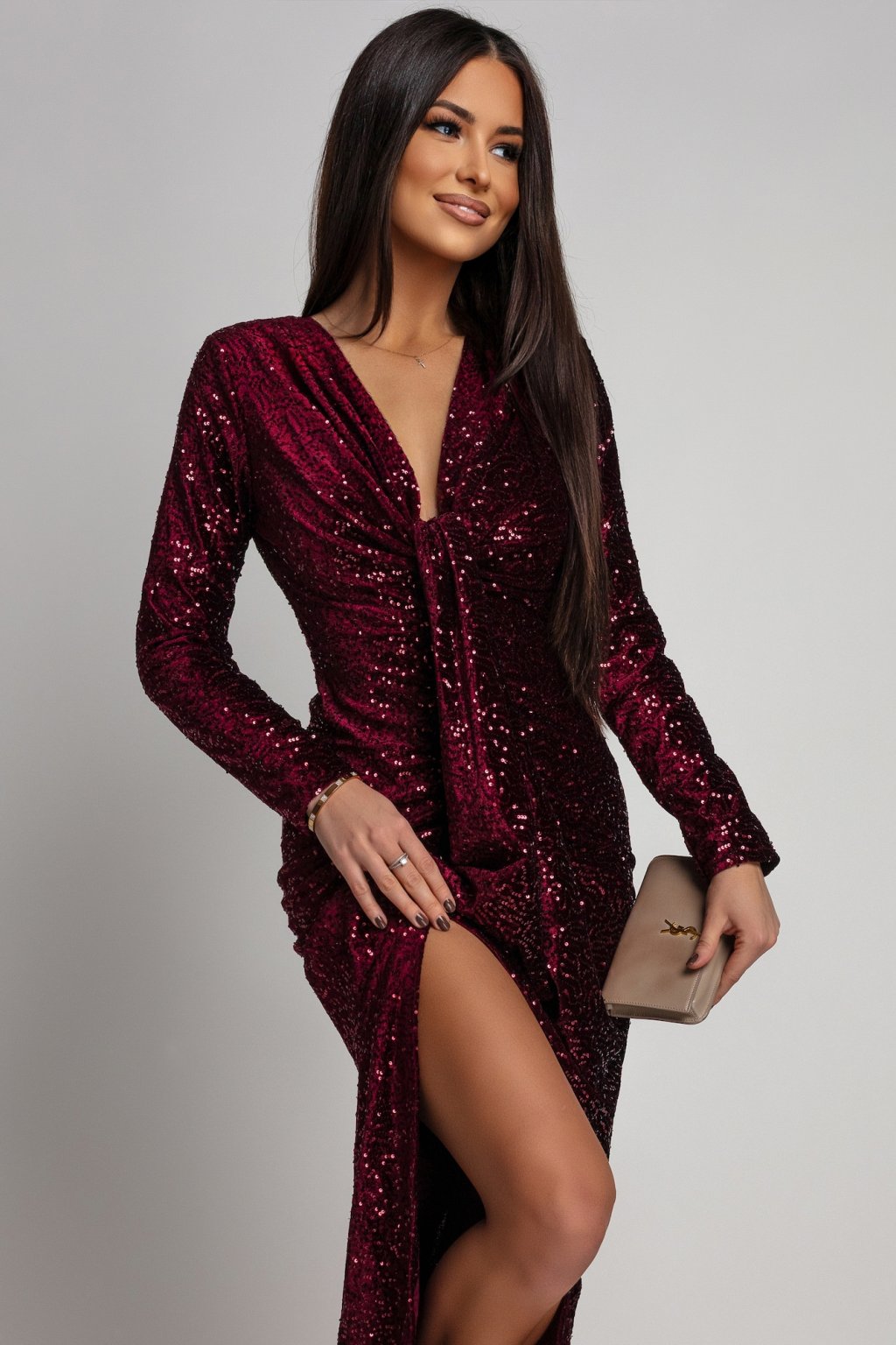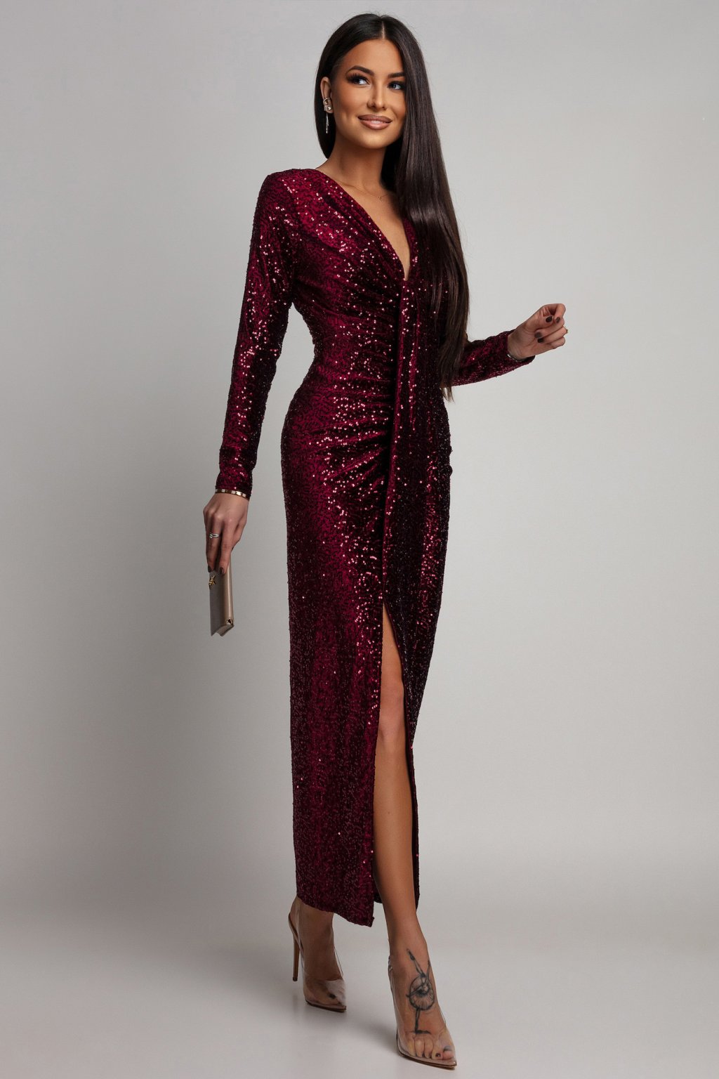 Bordové flitrované šaty s rozparkem