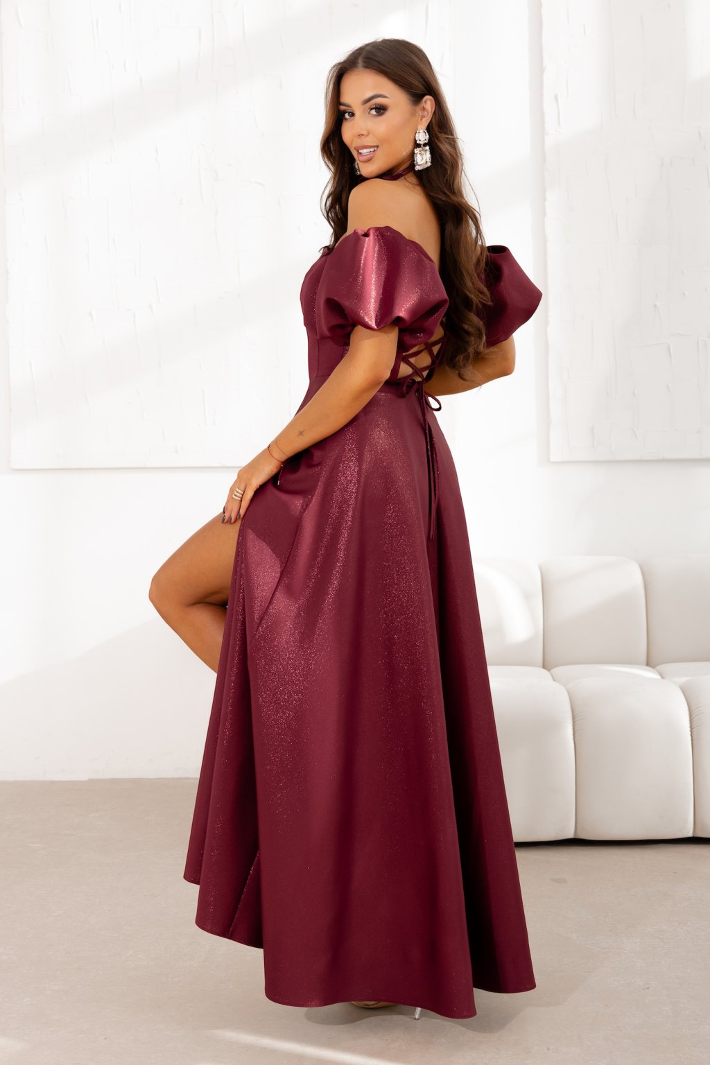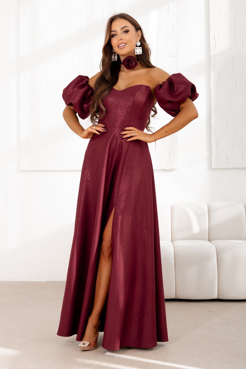 Bordové trblietavé šaty s rozparkom (Velikost L)