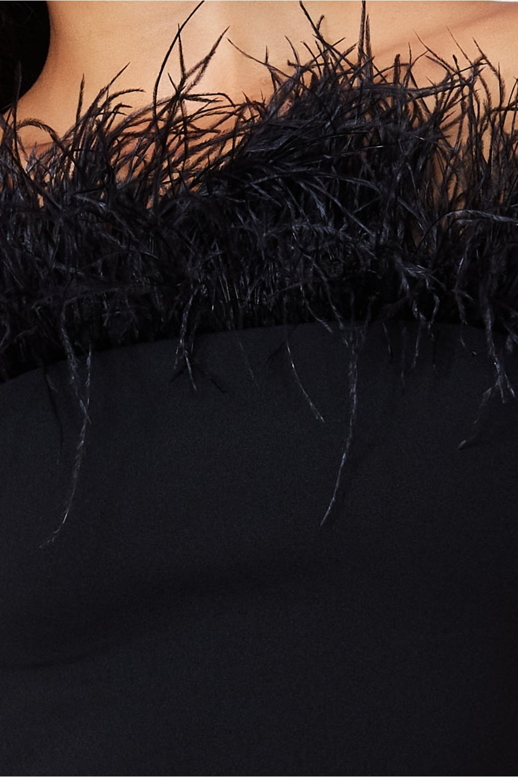 Pro milovnice nápadných kousků jsou tyto šaty jako stvořené. Poutavými je dělají pírka, která zdobí odhalený dekolt a rozparek se postará o sexy krok. Vzadu se šaty zapínají zipem, na prsou jsou vyztužené a materiál je elastický.