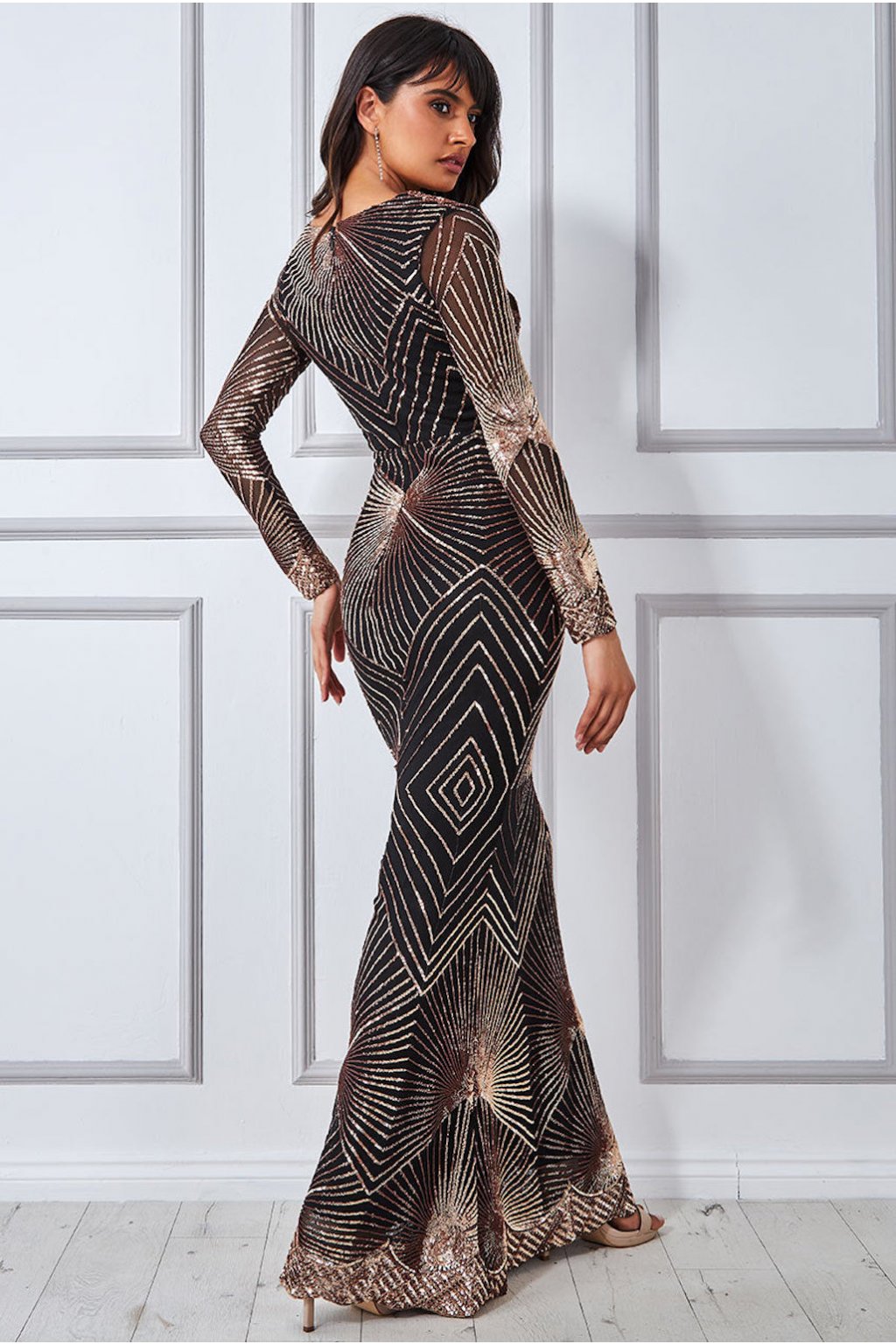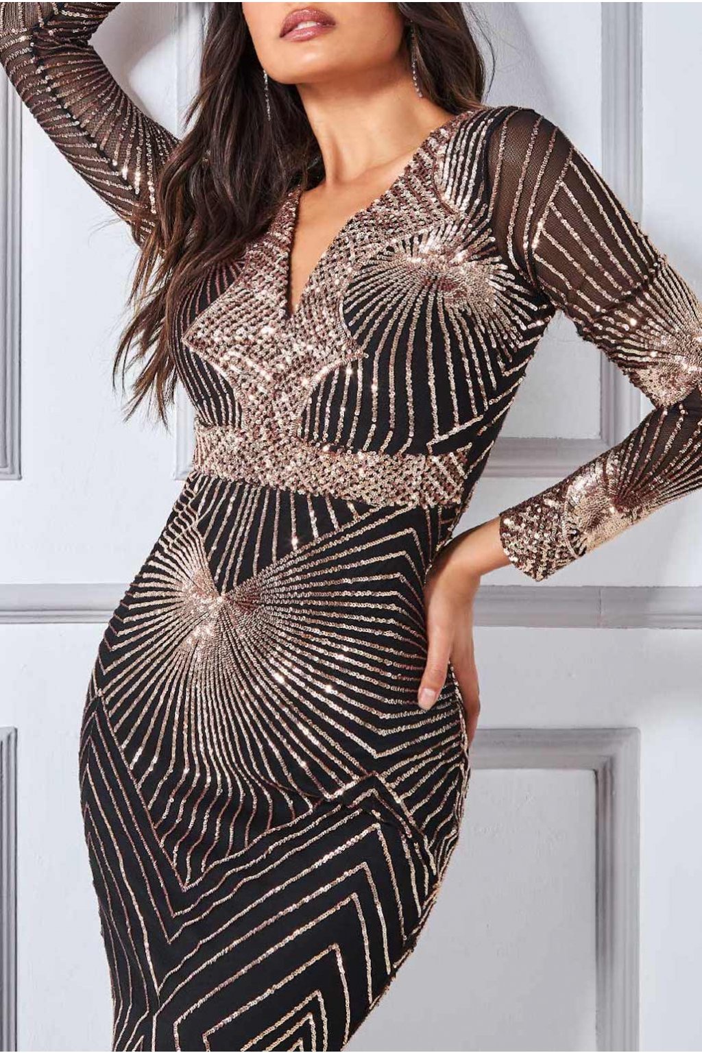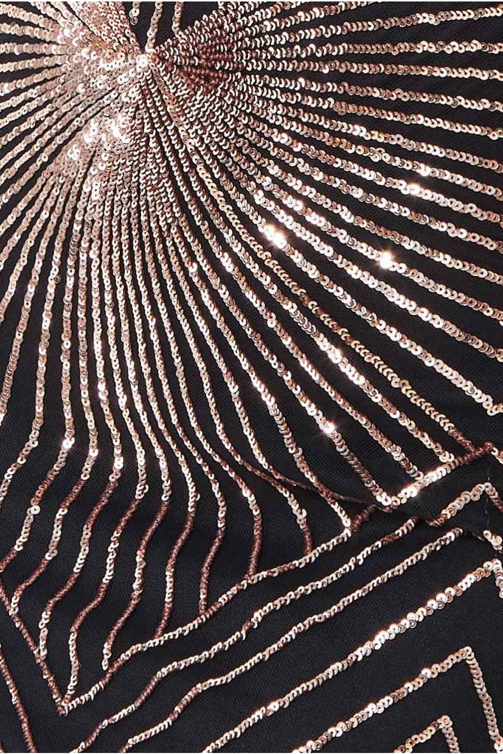Tyto půvabné šaty poseté flitry učarují dámám, které chtějí na společenské události rozhodně zazářit! Materiál šatů je elastický a vzadu se zapínají zipem.