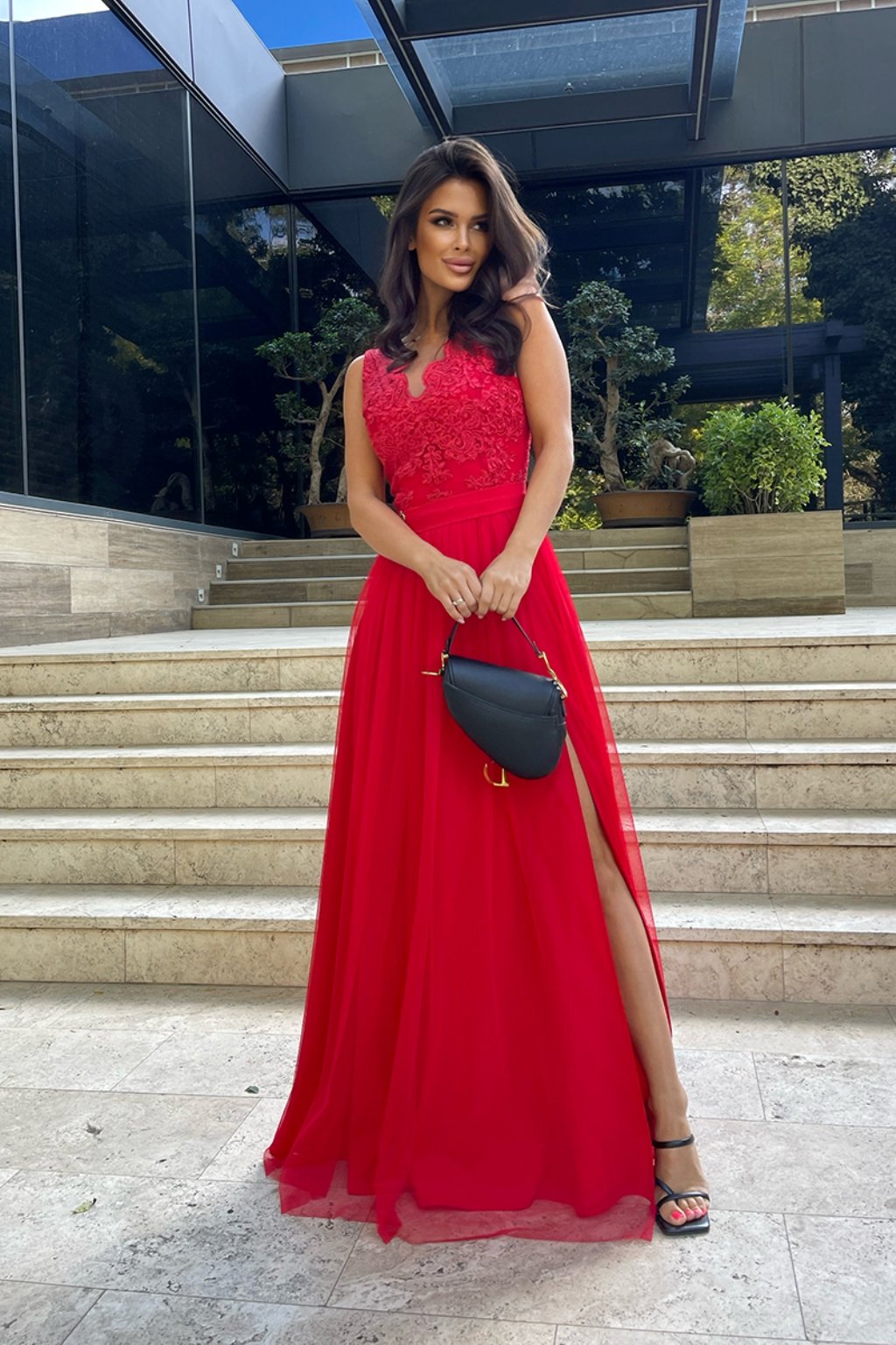 Červené společenské šaty s krajkou a tylovou sukní