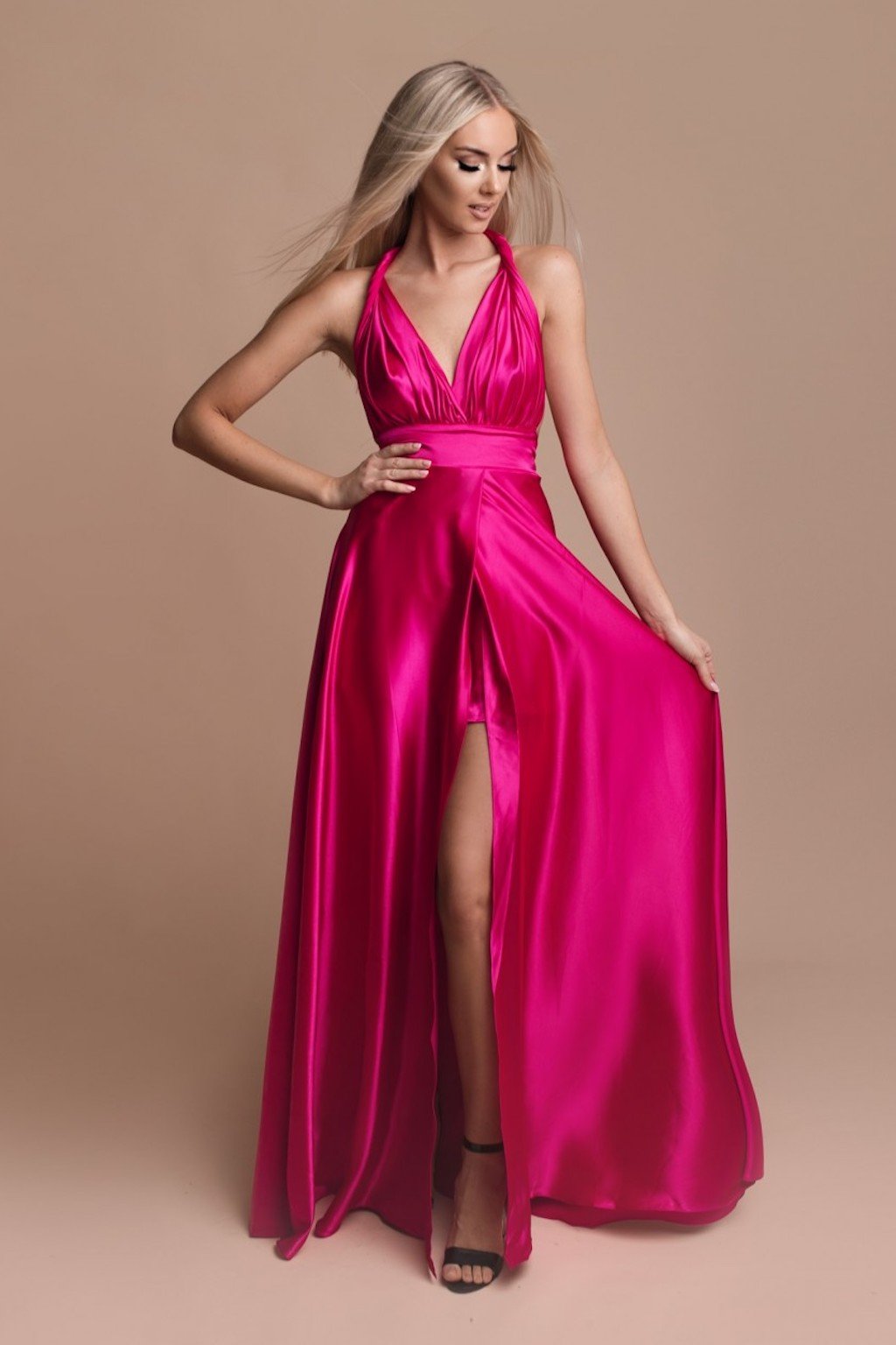 Cyklamenové lesklé šaty na vázání