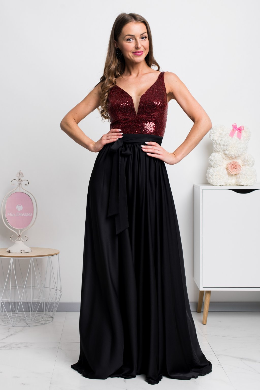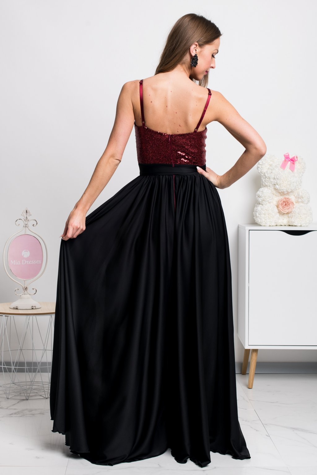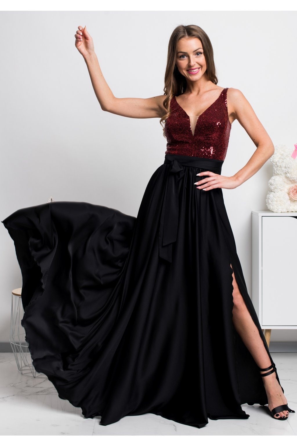 Dlouhé společenské šaty se saténovou sukní a flitry