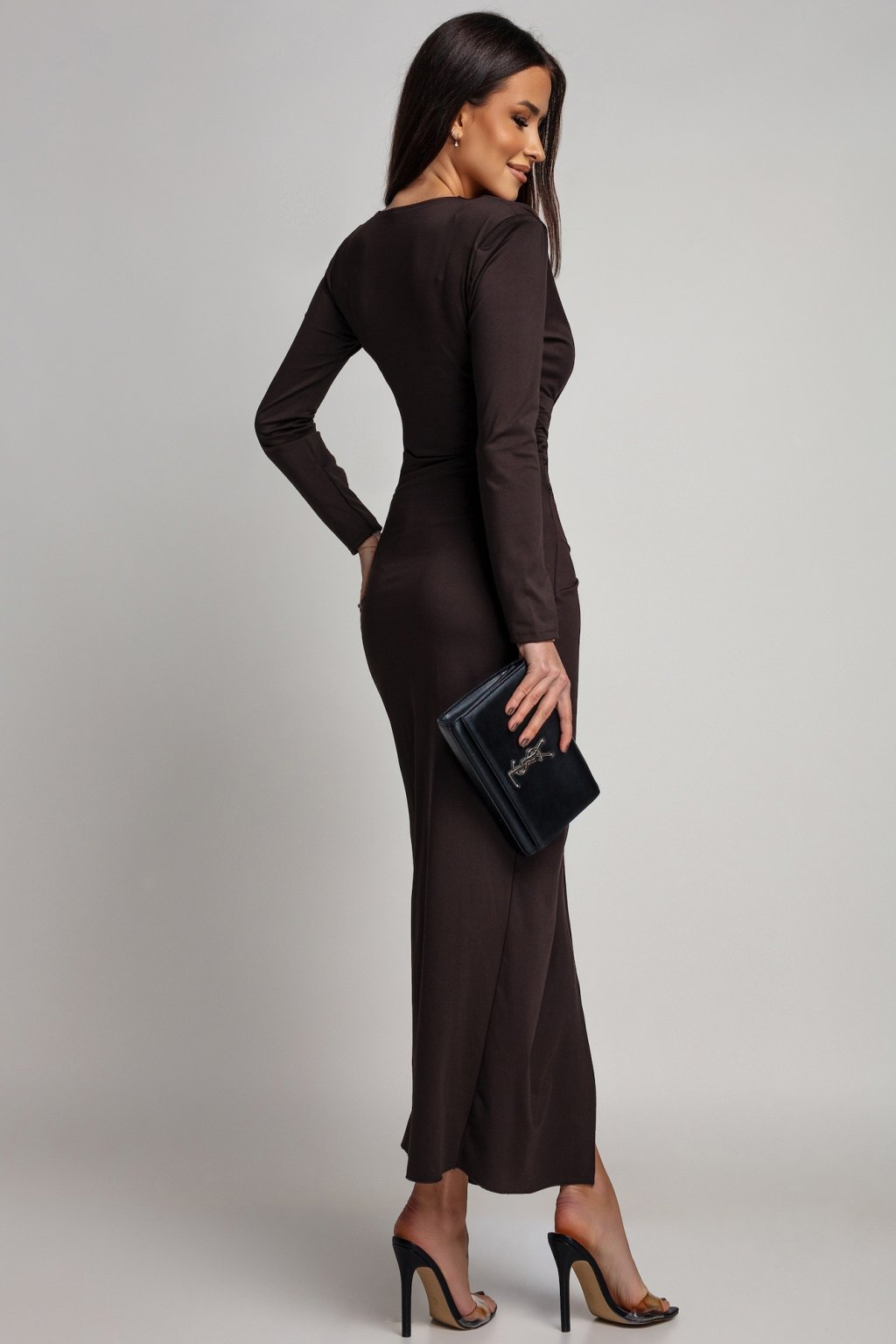 Hnědé přiléhavé šaty s hlubokým výstřihem
