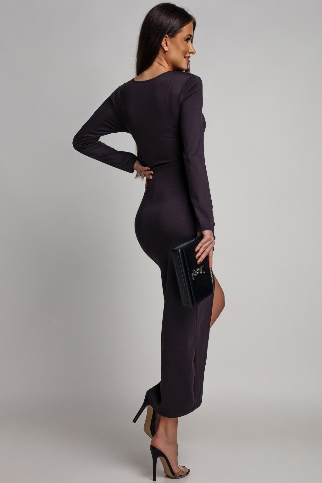 Hnědé přiléhavé šaty s rozparkem