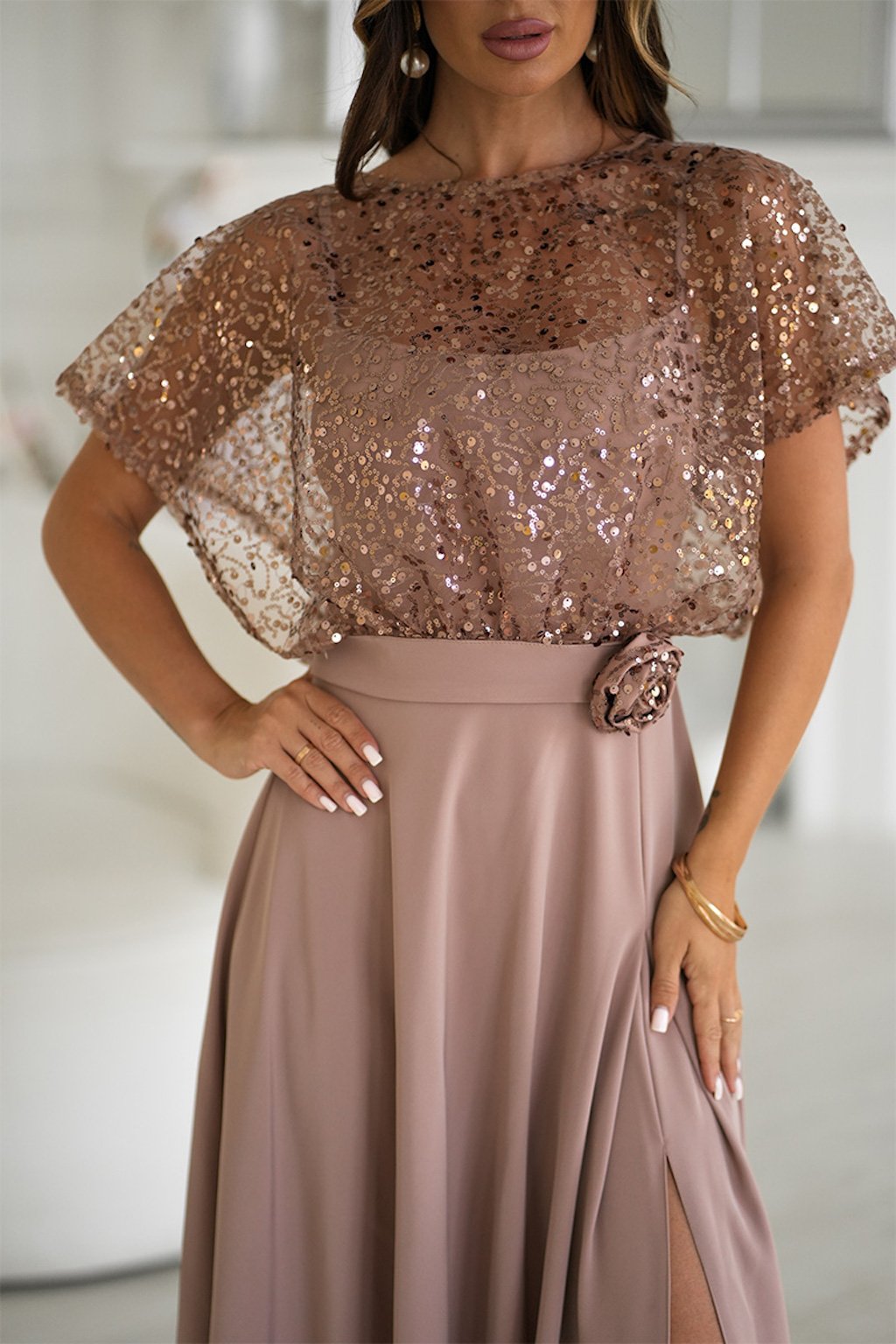 Hnědé společenské šaty s flitry
