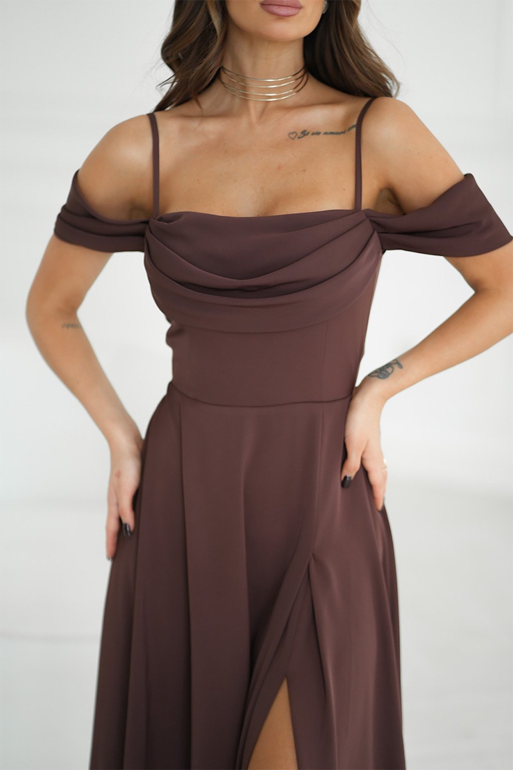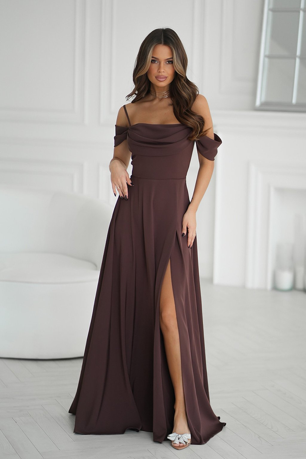Šaty spuštěné na ramena jsou symbolem ženské rafinovanosti a smyslnosti a v těchto společenských šatech vstoupí do místnosti šarmantní dáma. Šaty se vzadu zapínají zipem, ramínka mají nastavitelná a materiál je mírně elastický.