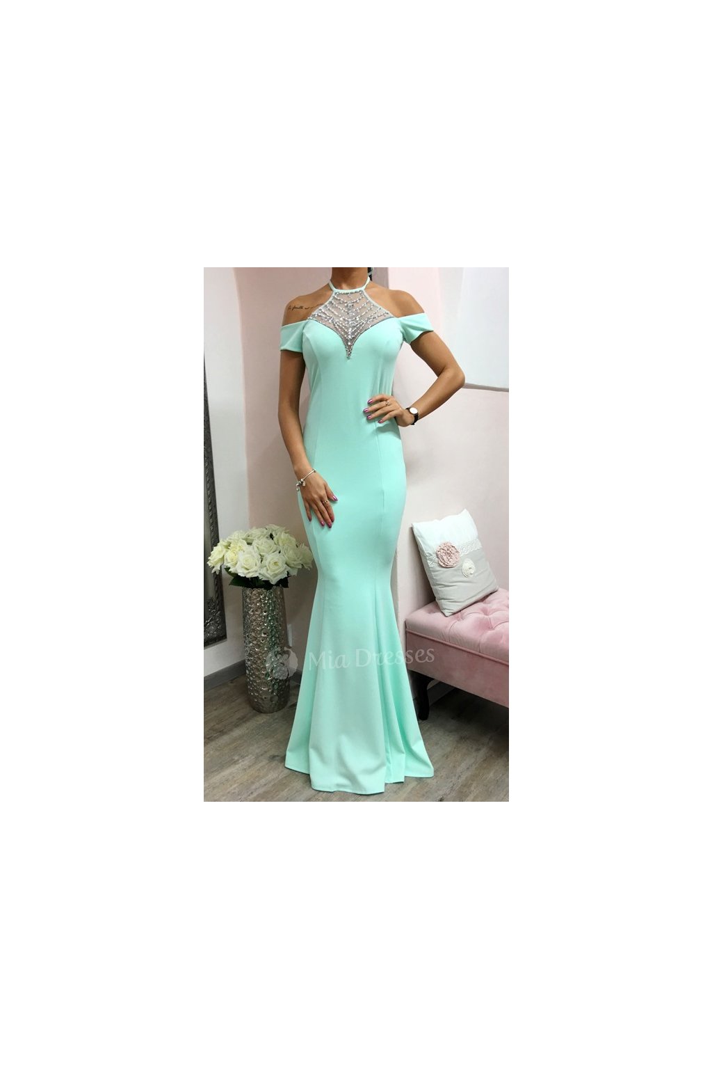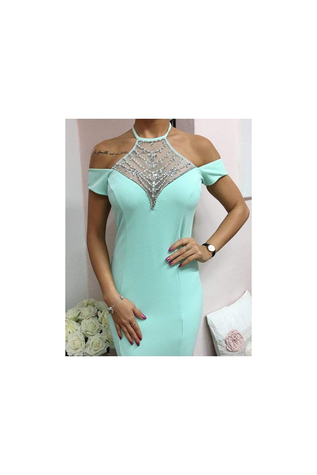 Krásné dlouhé společenské šaty v svěží mentolové barvě, mají vkusně a decentně vyzdobený dekolt kamínky a perličkami. Kolem krku se vážou a záda je odhalen. Jemná vlečka ve spodní části dodává šatům luxusní nádech. Vzadu se zapínají zipem a materiál je elastický. P>