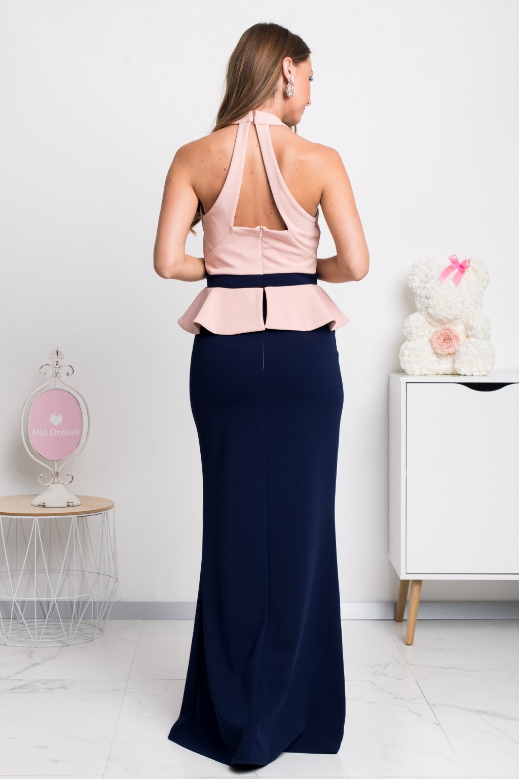 Modro-pudrové společenské šaty s peplum volánkem