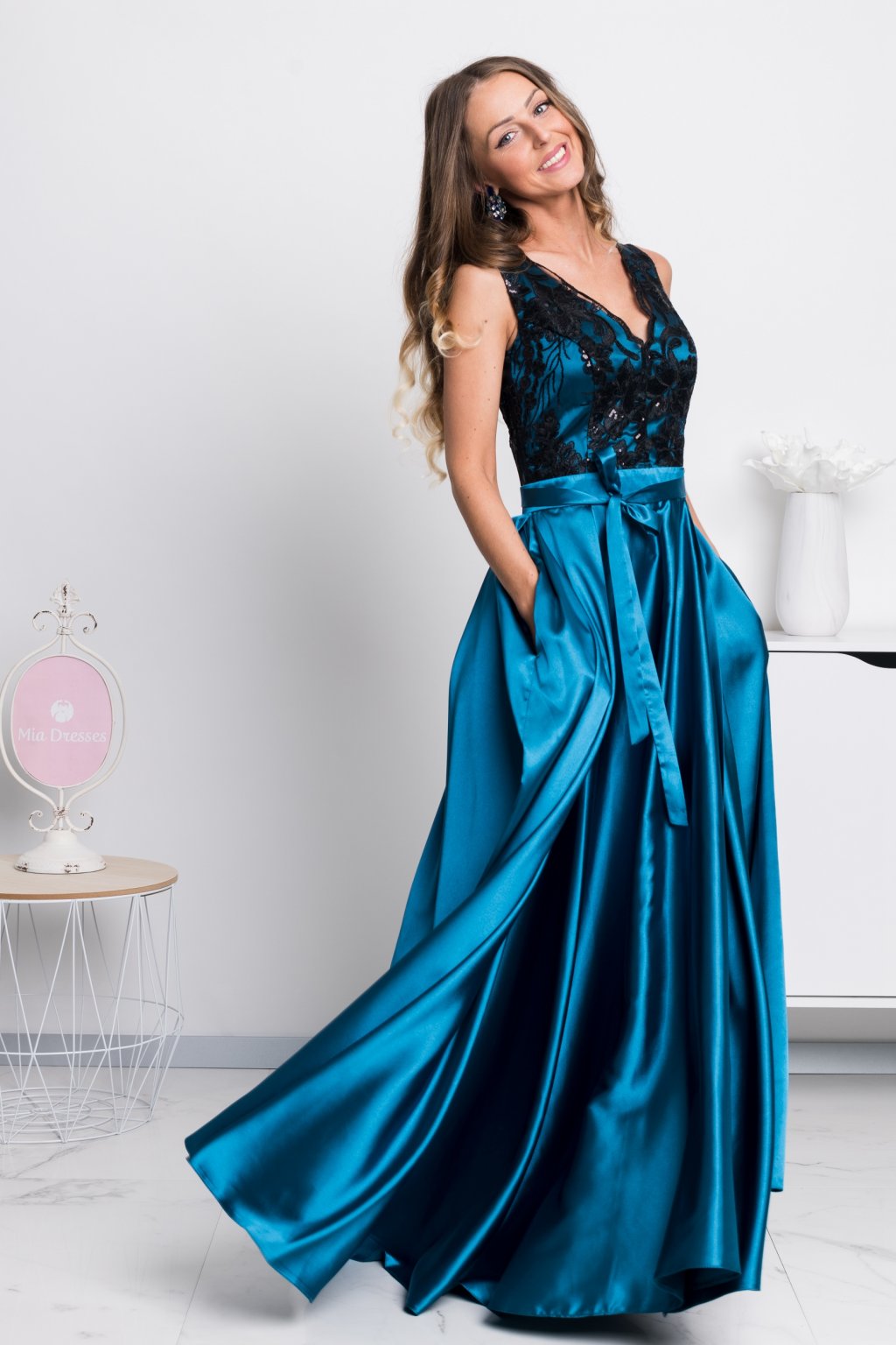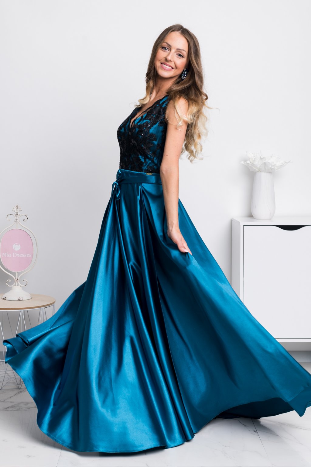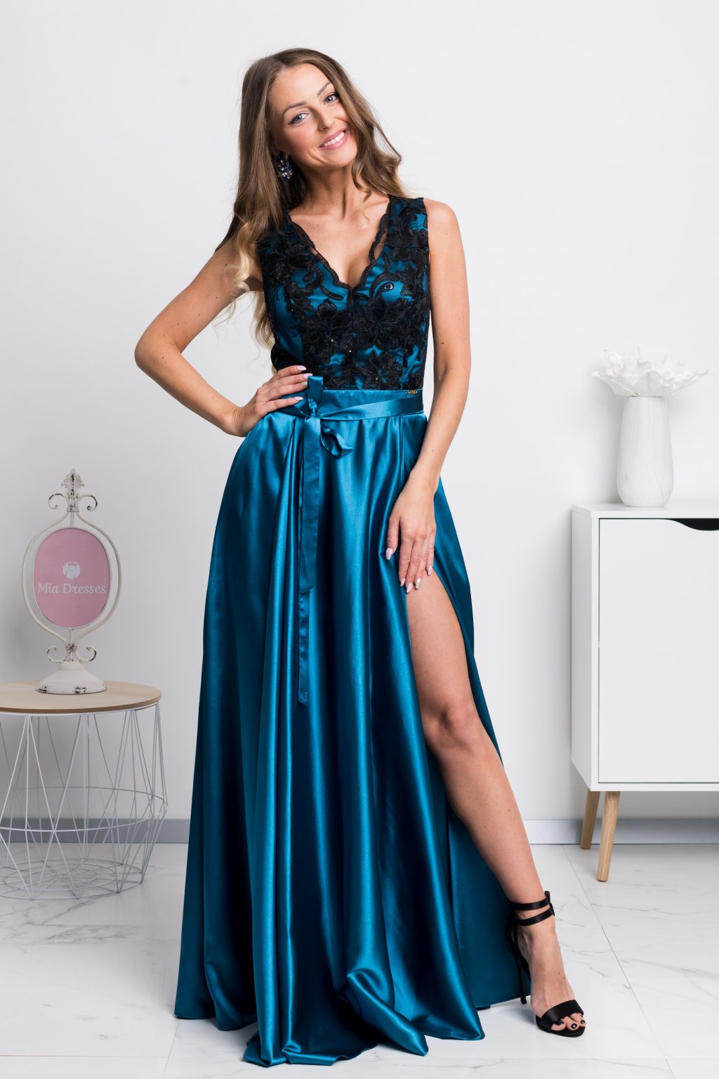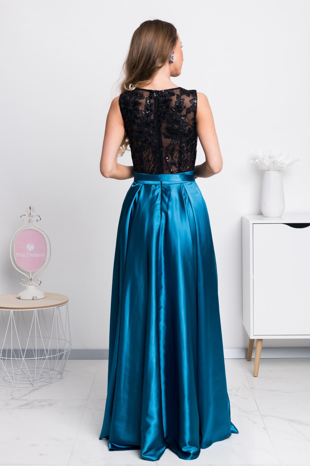 Petrolejové společenské šaty s černou krajkou