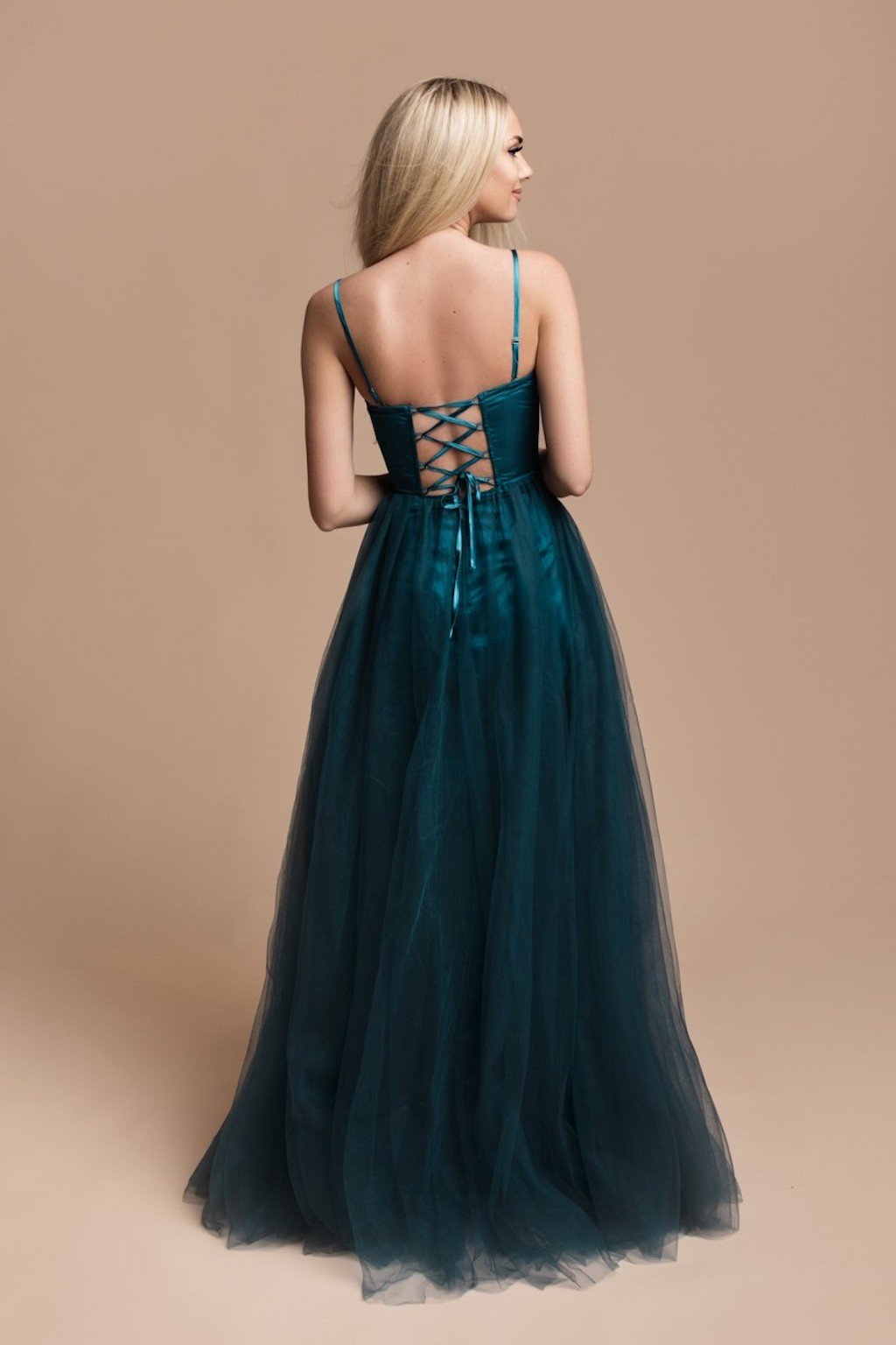 Tyto magické šaty z vás vykouzlí šarmantní dámu s velkou dávkou elegance a noblesy. Vázání na zádech působí sexy, ale zároveň rafinovaně a nadýchaná týlní sukně dodá vašemu vzhledu dívčí jemnost. Na sukni se šaty zapínají zipem, na prsou jsou vyztužené.