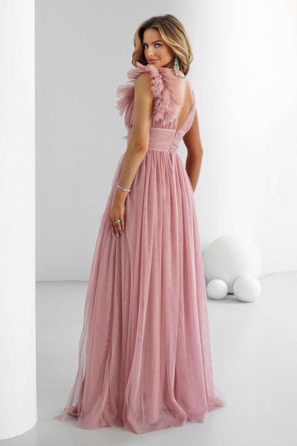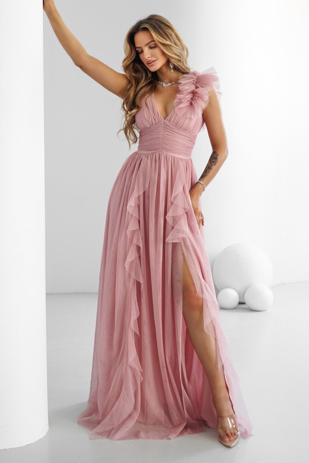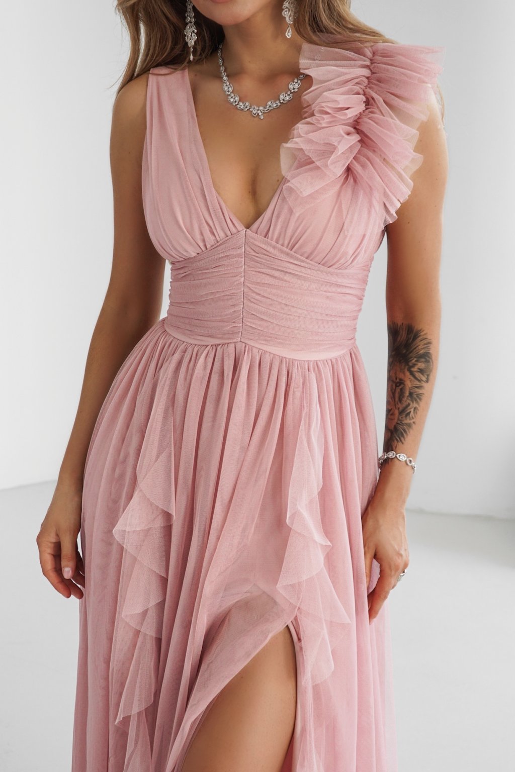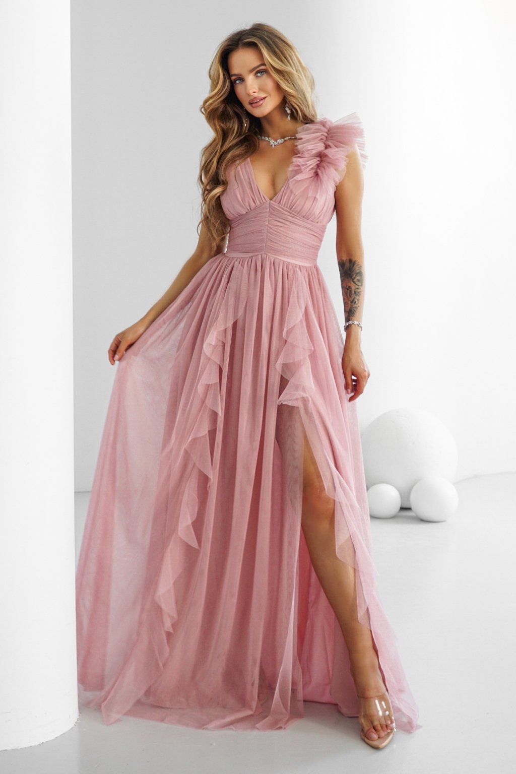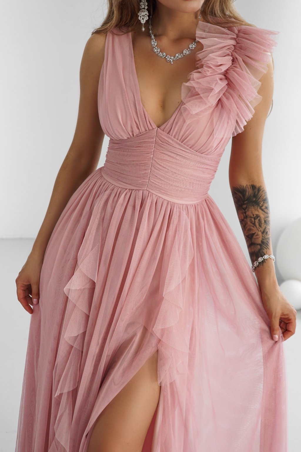 Růžové tylové šaty s rozparkem