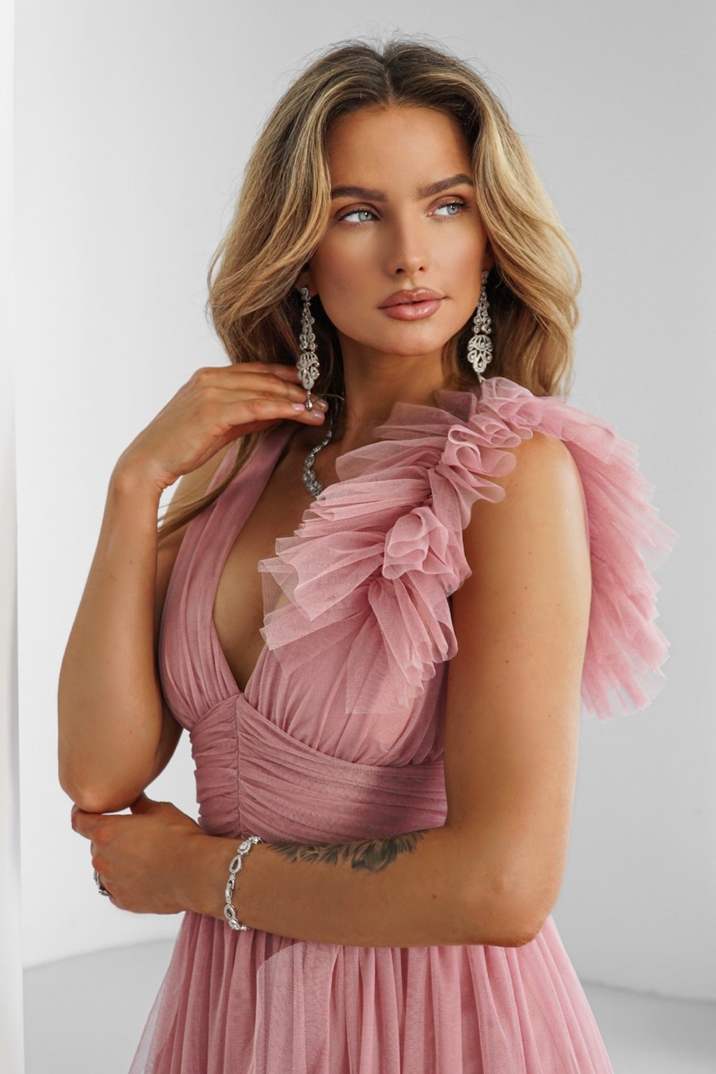 V těchto šatech zajisté učarujete každému pohledu. Výrazný tyl na rameni a rozparek, který odhalí krok zpoza nadýchaného tylu se postarají o elegantní, noblesní a smyslný vzhled.