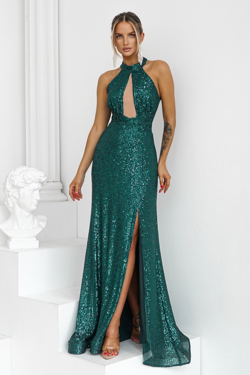 Smaragdové flitrované šaty s rozparkem