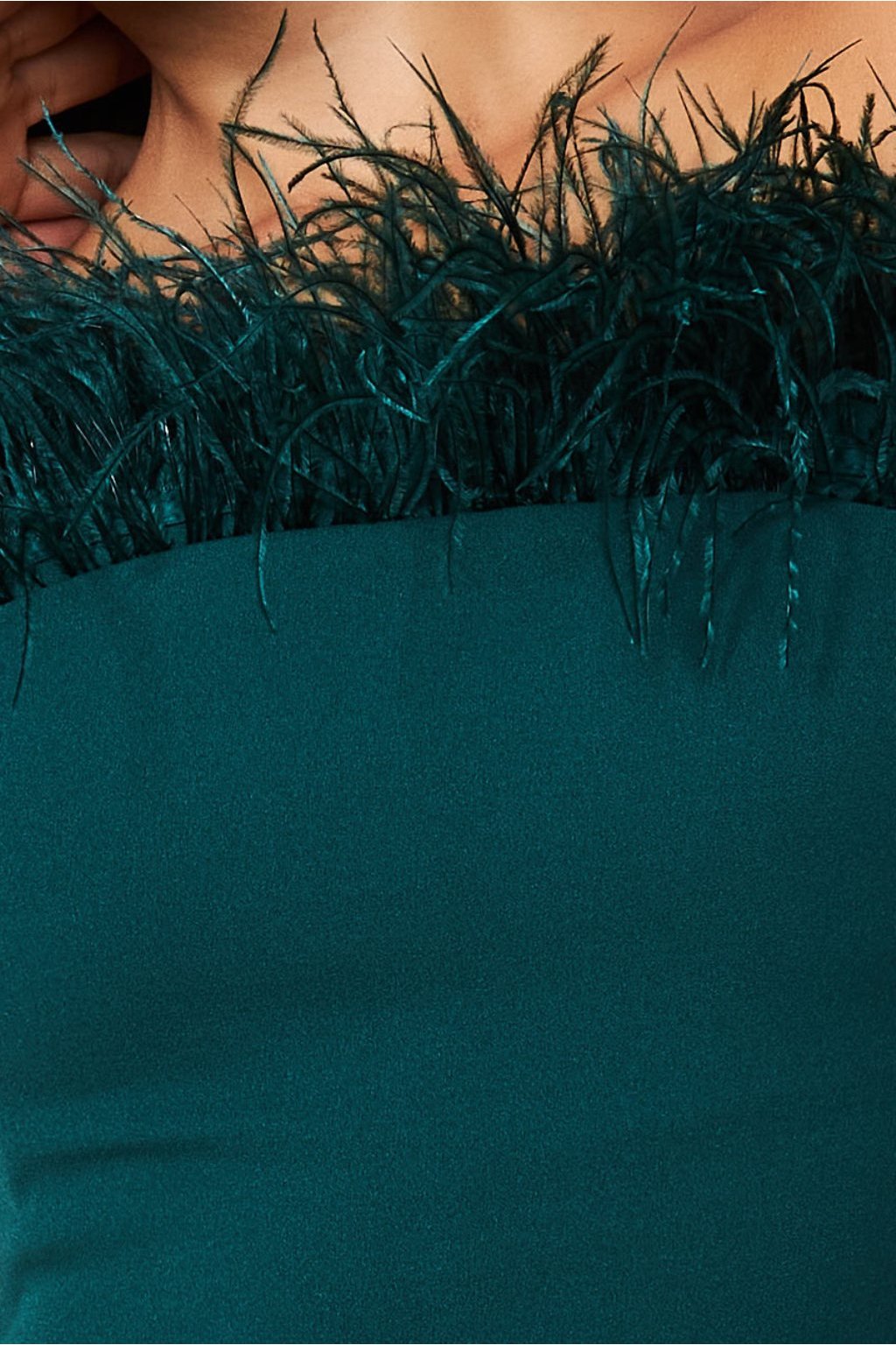 Pro milovnice nápadných kousků jsou tyto šaty jako stvořené. Poutavými je dělají pírka, která zdobí odhalený dekolt a rozparek se postará o sexy krok. Vzadu se šaty zapínají zipem, na prsou jsou vyztužené a materiál je elastický.