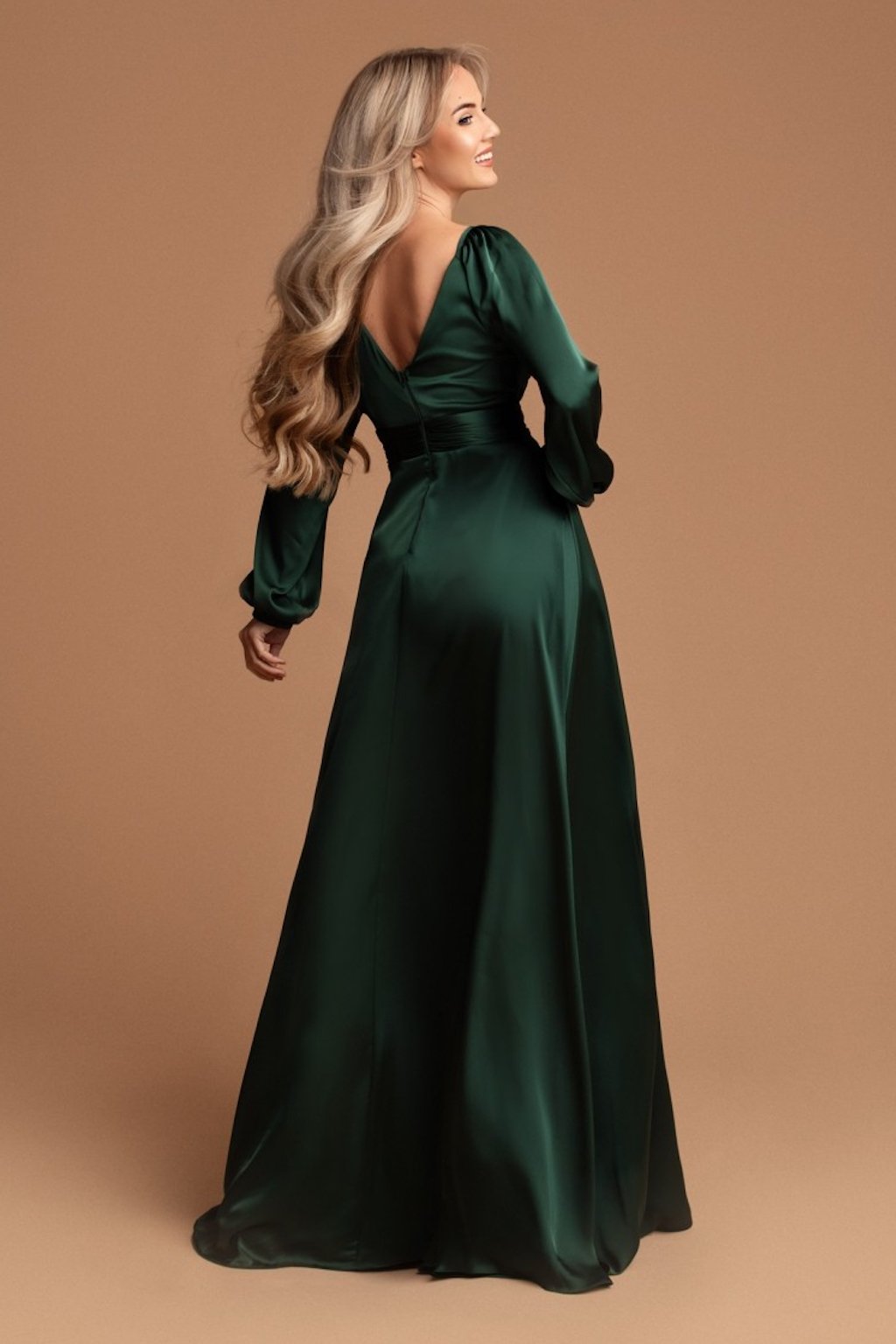 Smaragdové saténové šaty s rozparkem