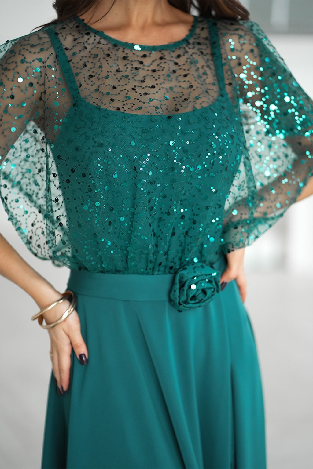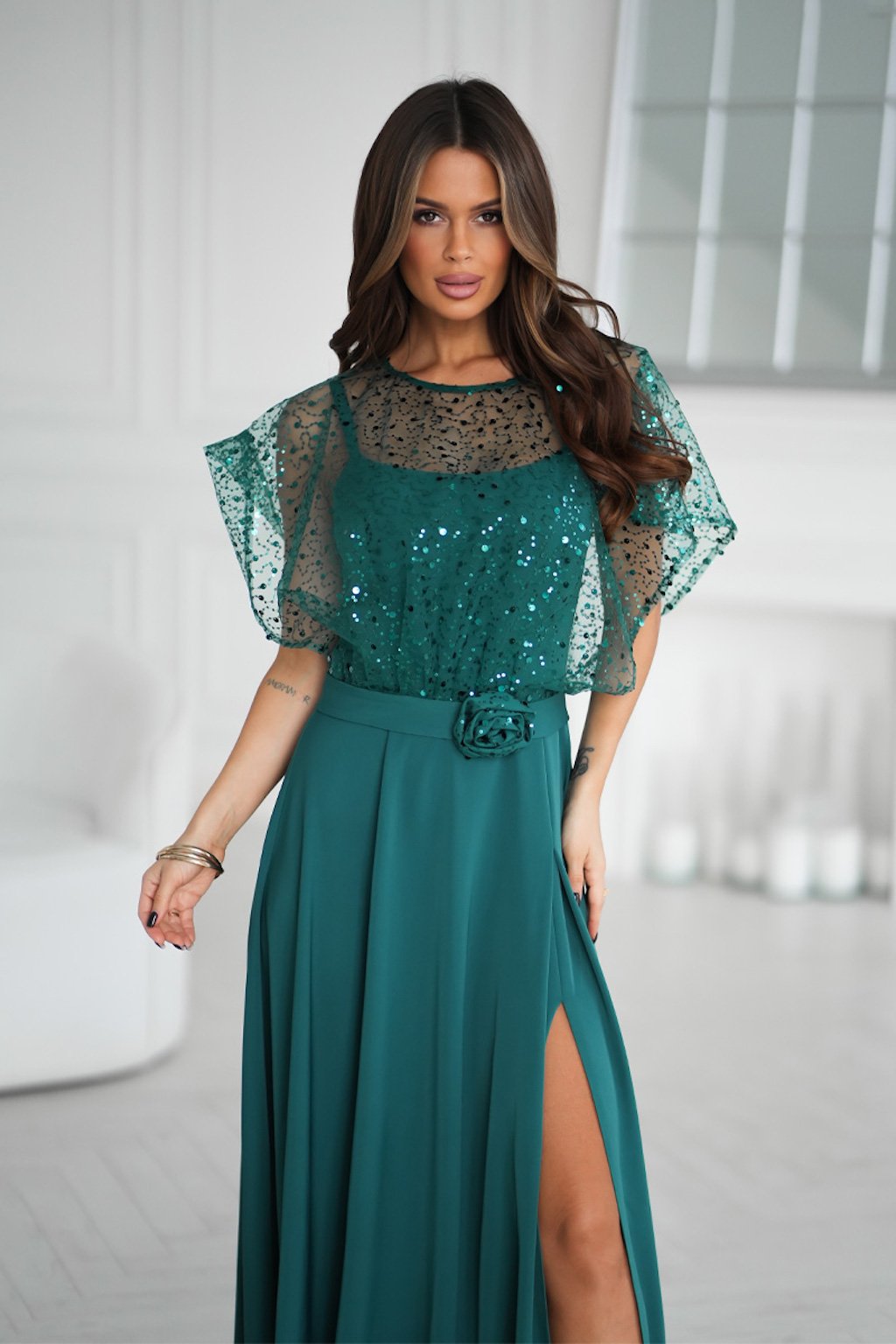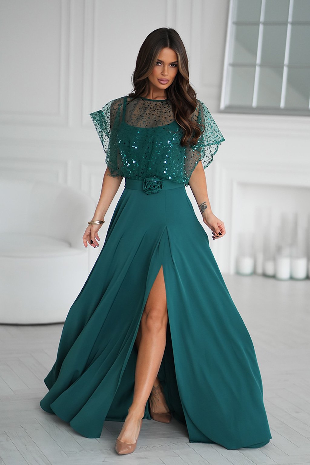 Dvojnásobně okouzlující... Tyto šaty v sobě nesou jemnost i variabilitu. Třpytivý flitrovaný plášť dodává outfitu éterický půvab a pohádkový nádech – ale stačí jediný pohyb a proměníš se na elegantní dámu v čistých liniích. Poutavý detail květu v pase a jemně rozšířená sukně s rozparkem dělají z těchto šatů dokonalý výběr pro chvíle, kdy se chceš cítit výjimečně – ve vlastní kůži i ve světle reflektorů. Šaty se vzadu zapínají zipem a ramínka nemají nastavitelná.