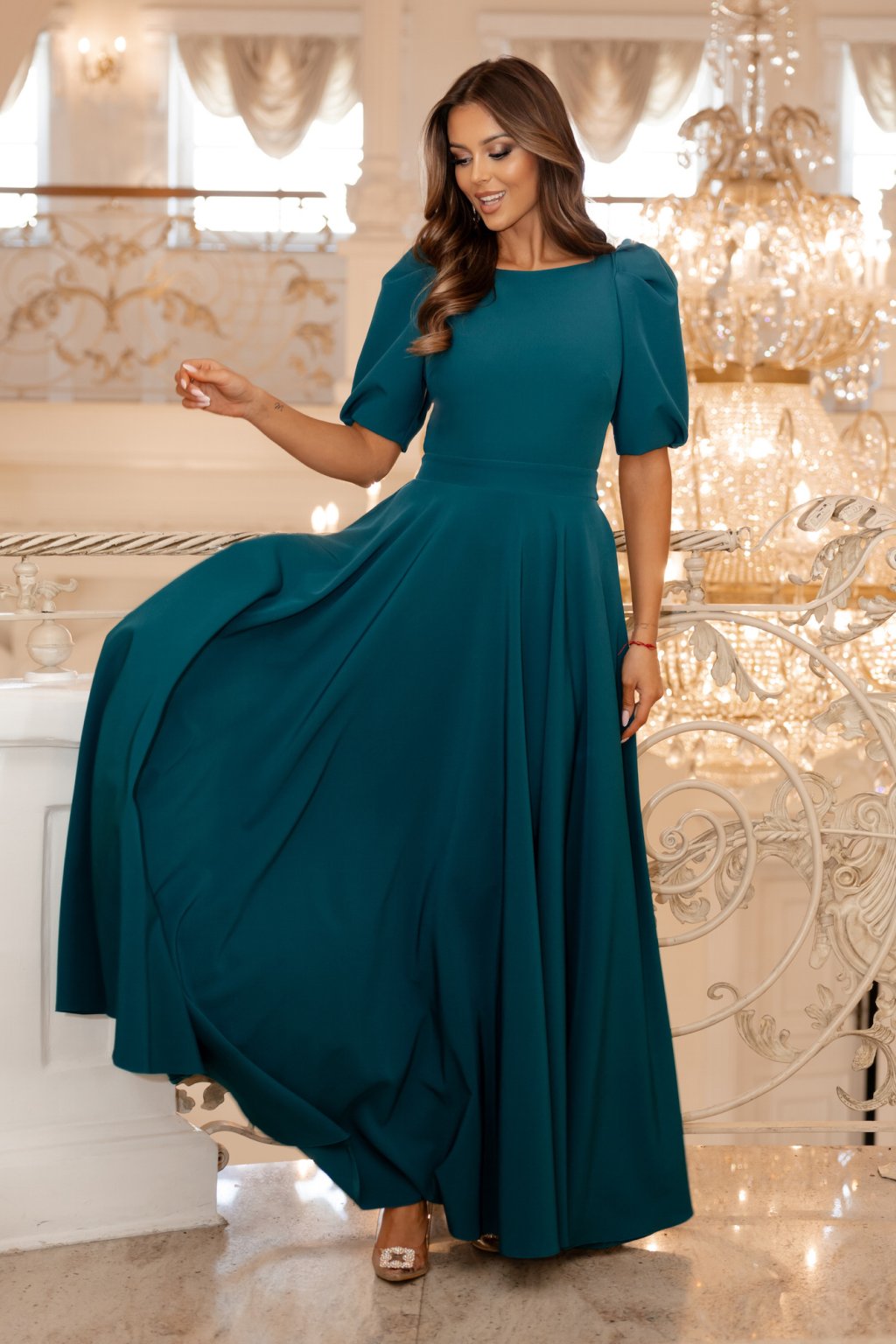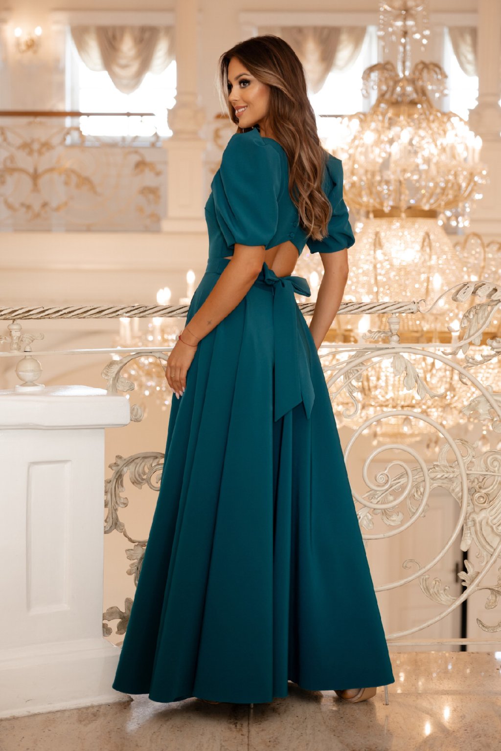 V těchto krásných šatech vykročíte na společenskou událost s velkou dávkou elegance, šarmu a noblesy. Nadýchané rukávy a poodhalená záda doplňují šatům smyslnost. Vzadu na sukni se zapínají zipem.