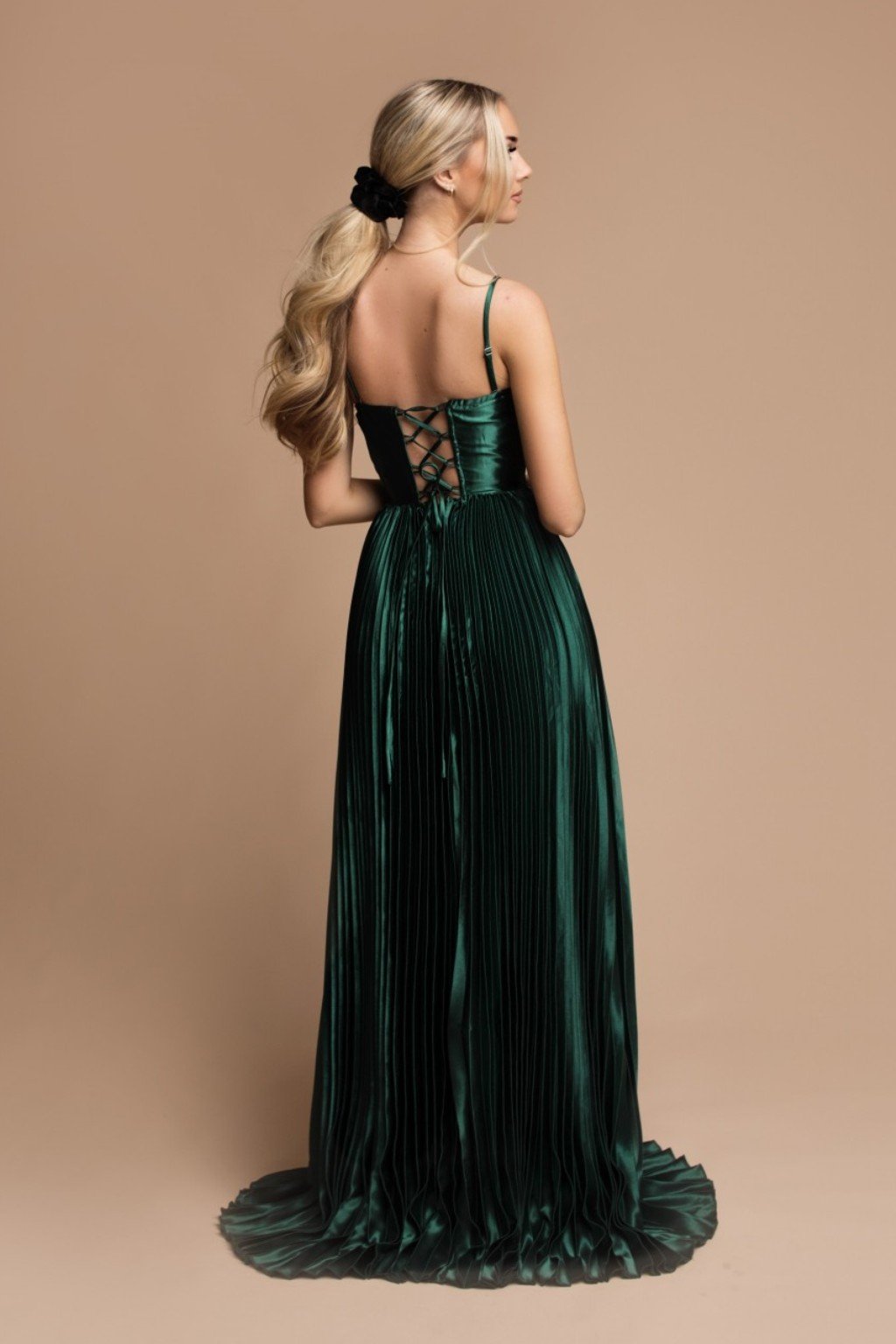 Tyto magické společenské šaty z vás vykouzlí šarmantní dámu s velkou dávkou elegance a noblesy. Vázání na zádech působí sexy, ale zároveň rafinovaně a v plisované sukni budete zaručeně nepřehlédnutelná. Vzadu na sukni se zapínají zipem a součástí šatů jsou odnímatelná ramínka.
