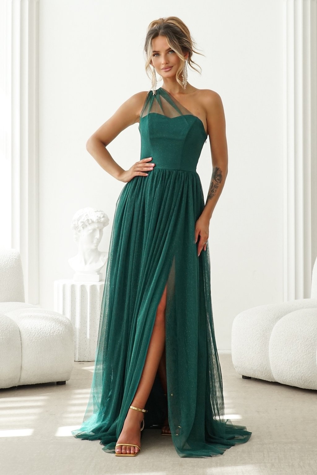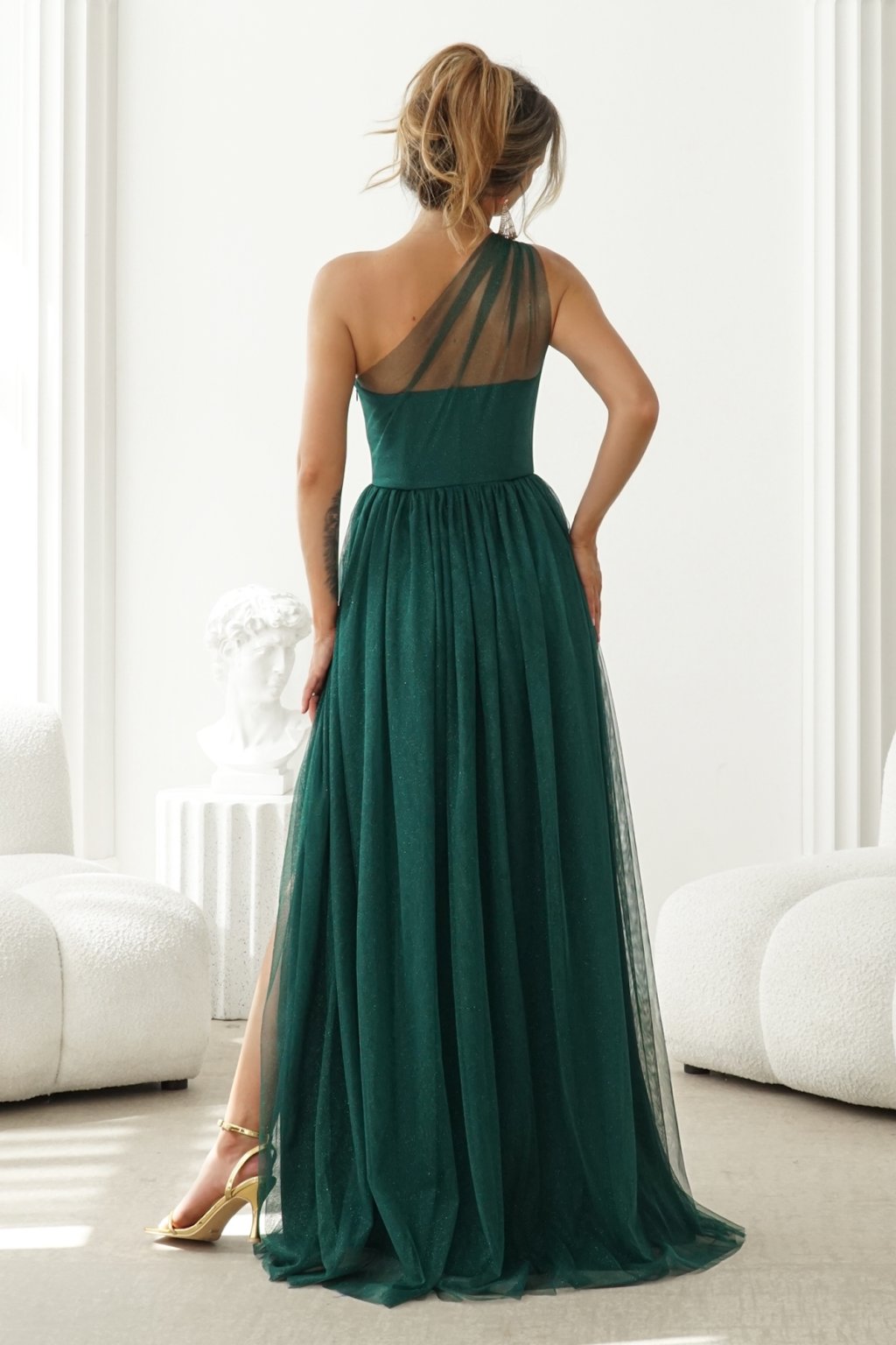 Tyto šaty vynikají svojí éterickou elegancí a ženským šarmem. Asymetrický střih s jedním ramínkem dodává šatům moderní nádech a jemně splývavá sukně s rafinovaným rozparkem působí lehce a romanticky. Ideální výběr pro výjimečné události, kde chcete zazářit s ladností a sofistikovaností. Na boční straně se šaty zapínají zipem.