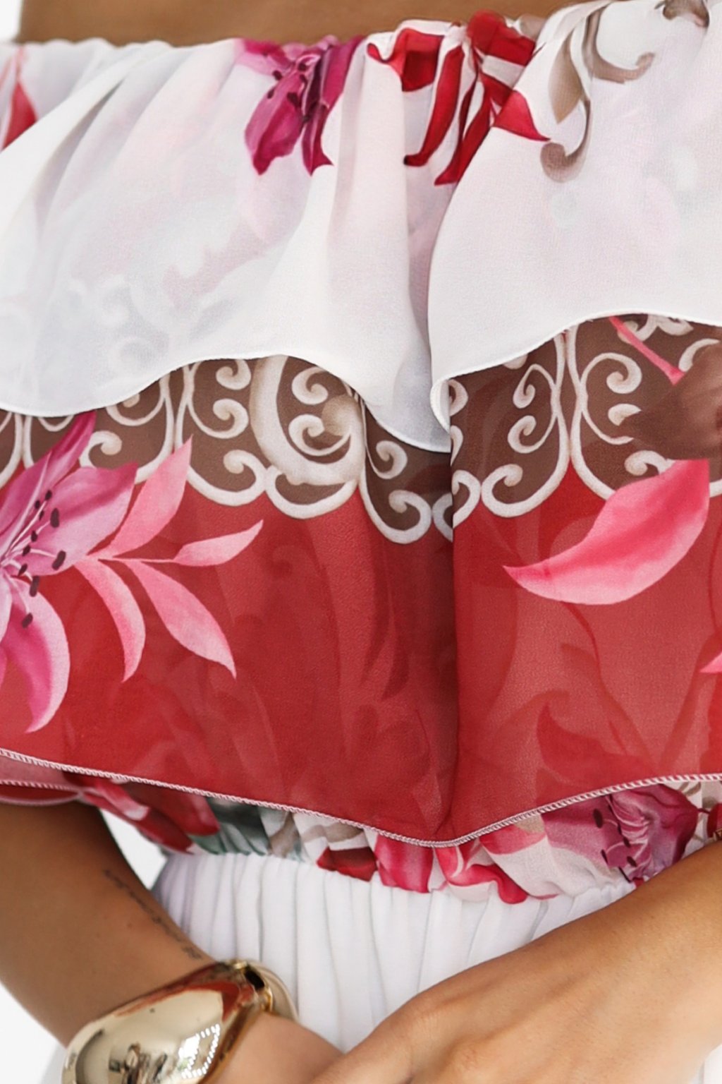 Zahalte se do letní romantiky s těmito výraznými šatami. Lehoučký materiál, květinový potisk a rafinované volány přes ramena vytvářejí dokonalou kombinaci ženskosti a jemné extravagance. S těmito šaty zazáříš, ať se vybereš kamkoli.