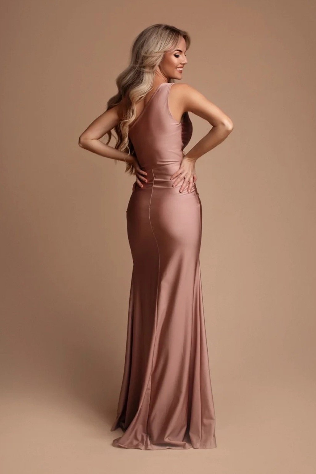 Krásné společenské šaty, které za sebou zanechají závan luxusu a elegance. Vysoký rozparek se postará o okouzlující krok a vy budete na parketu zaručeně královnou. Šaty jsou na prsou vyztužené, na boční straně se zapínají zipem a materiál je elastický.