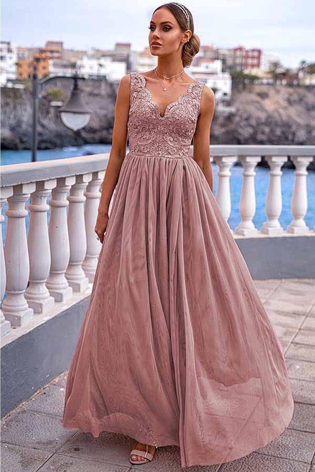 Starorůžové společenské šaty s tylovou sukní a rozparkem