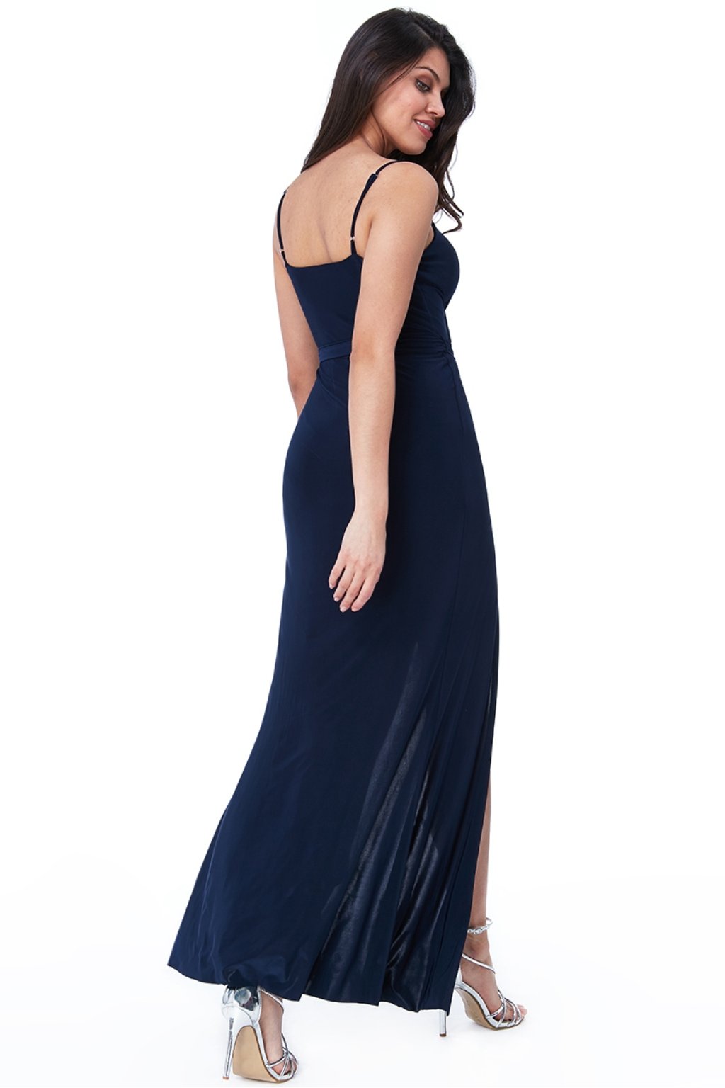 Tmavě modré dlouhé šaty s vysokým rozparkem