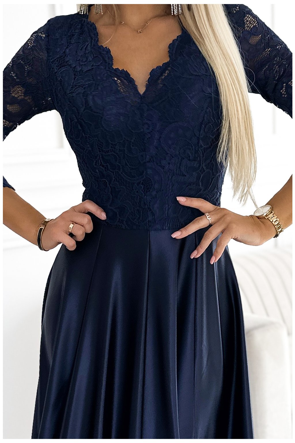 Tmavě modré lesklé šaty s krajkou