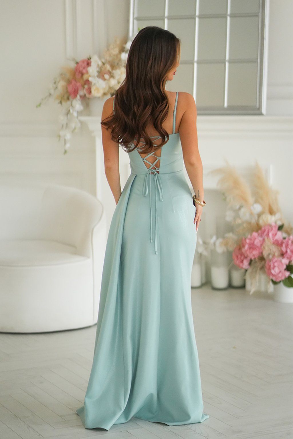 Elegantní šaty, které v sobě spojují moderní design a nadčasový glamour. Působí mimořádně elegantně, luxusně a jsou stvořeny pro momenty, které si zaslouží nezapomenutelný outfit. Vzadu na sukni se zapínají zipem a ramínka jsou odnímatelná.