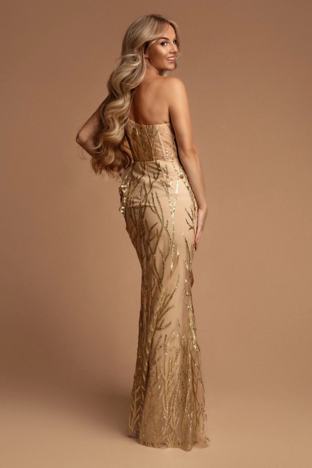 Pro milovnice nápadných kousků jsou tyto šaty jako stvořené. Poutavými je dělají flitry, kterými jsou šaty poseté a projmutý střih, který podtrhne ženské křivky. Šaty jsou na prsou vyztužené a vzadu se zapínají zipem. Brož, která zdobí pas je odnímatelná. Třpytky nejsou všity do materiálu, přirozeně opadávají.