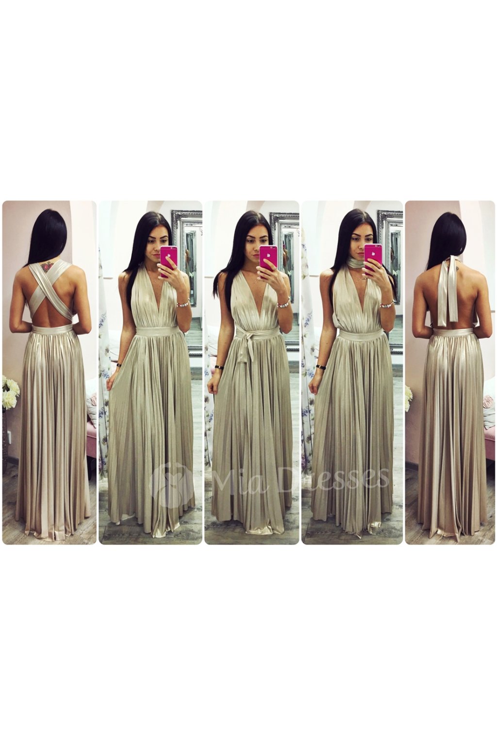 Zlatá je prostě in. Když se k ní přidá tento střih šatů, vznikne přímo mistrovké dílo. Plisovaná, padavá sukně a hluboký výstřih, který doporučujeme ukázat bez podprsenky, jen podtrhnou výjimečnost tohoto outfitu. Šaty jsou přes prsa podšité, na boční straně mají zapínání na zip.