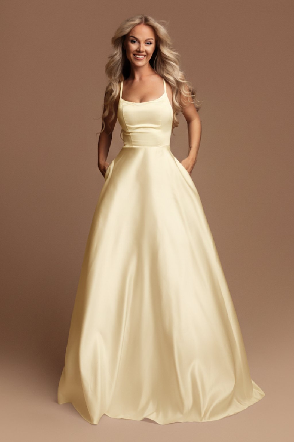 Nadýchaná sukně a krásný lesklý materiál, to je prostě noblesní kombinace, ve které na společenské události zajisté zazáříte. Šaty jsou na prsou vyztužené, na sukni pod šněrováním se zapínají zipem a ramínka mají nastavitelná.