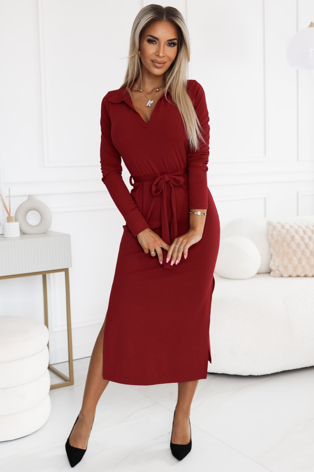 Bordové midi šaty s rozparky