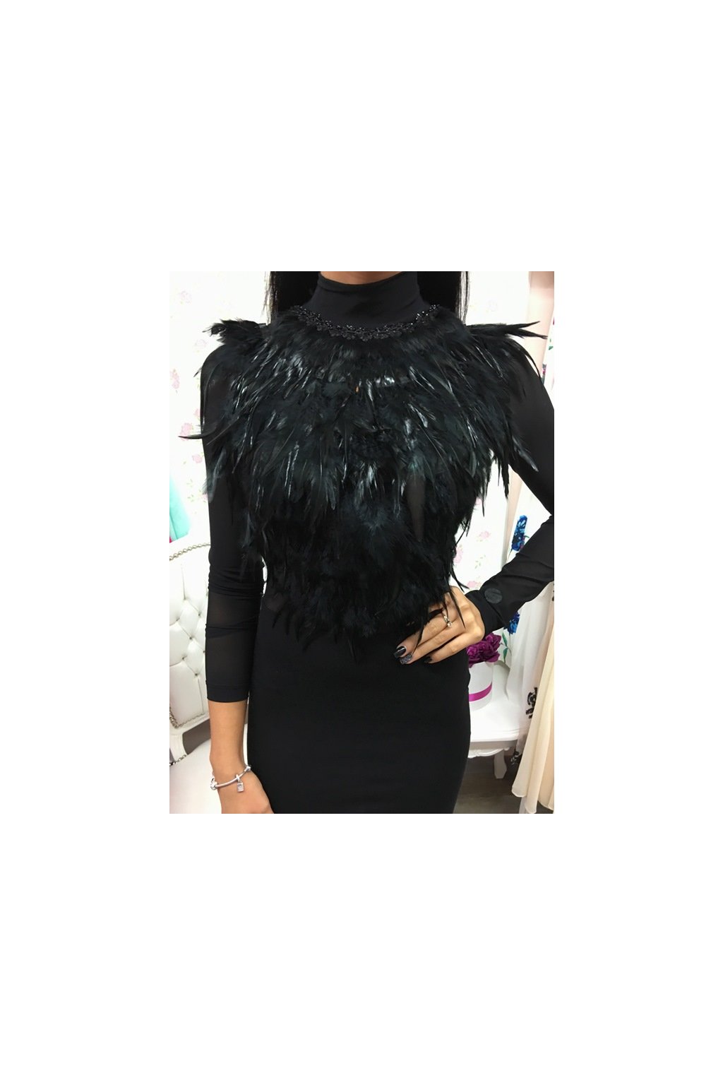 Tento glamour kousek vás odliší od každého outfitu v místnosti. Tylová vrchní část, mírně lesklé pírka našité na hrudi a roláček vytvoří dokonalé spojení detailů. Roláček se zapíná knoflíky. Šaty jsou z elastického přiléhavého materiálu.