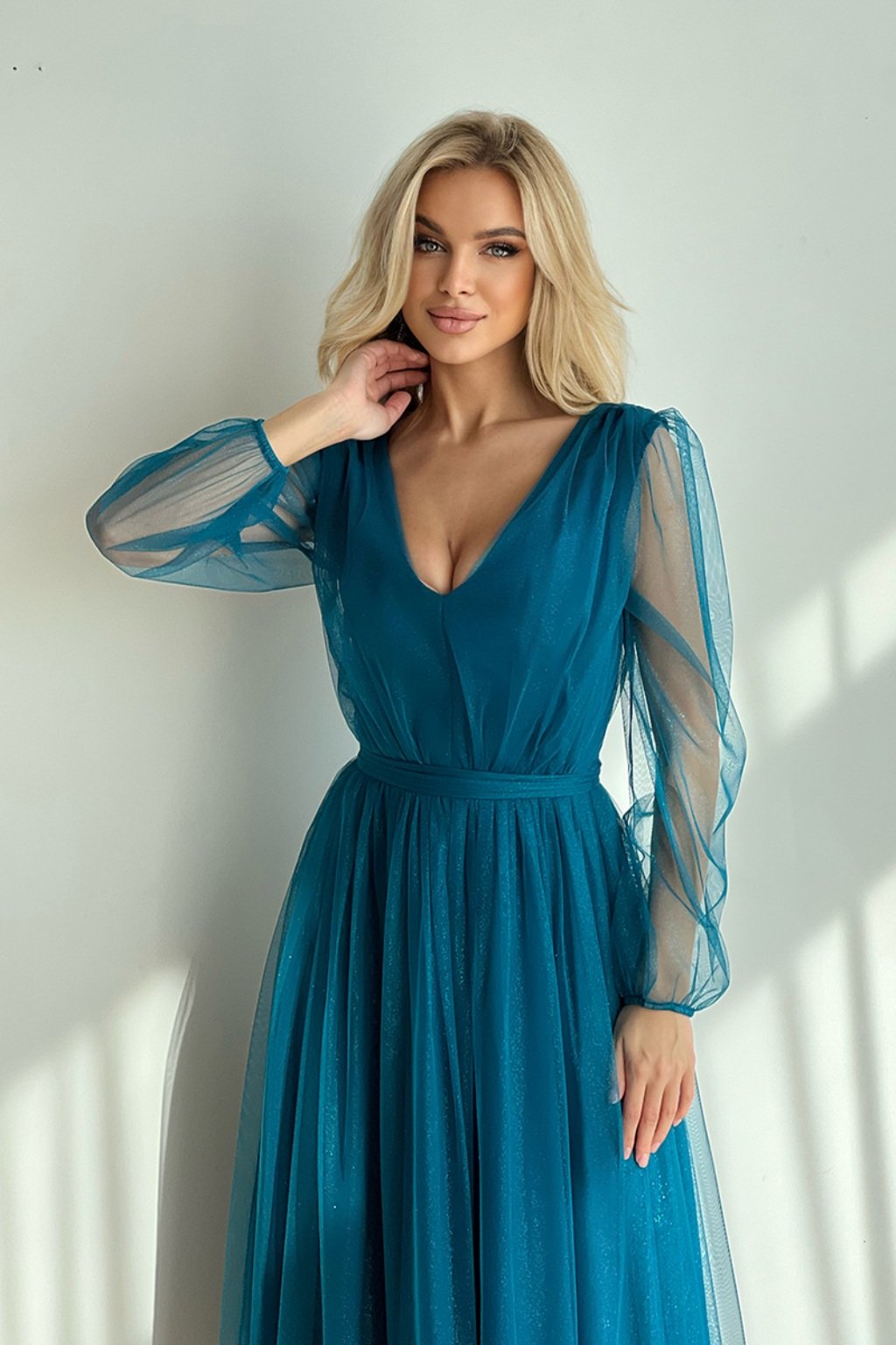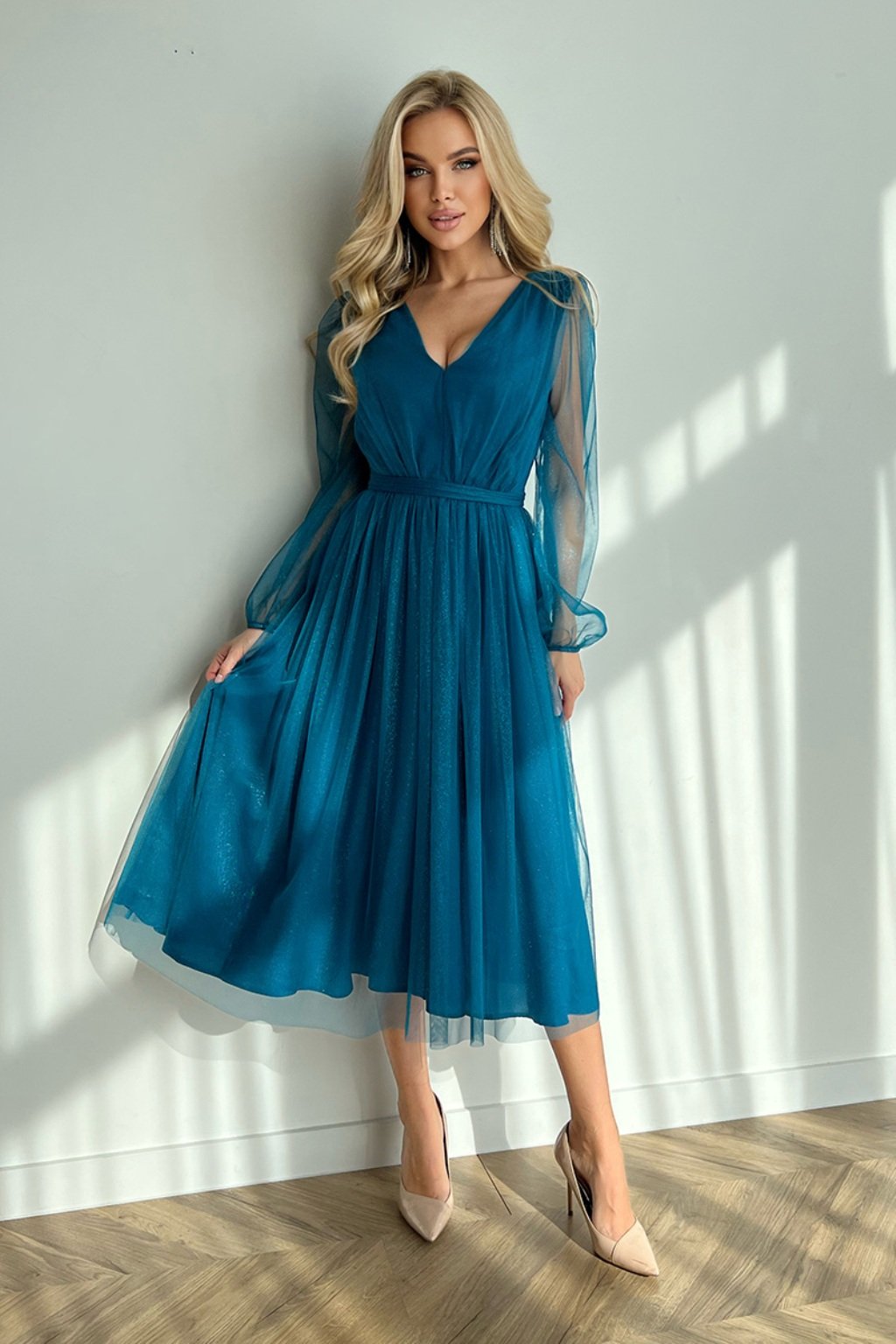 Petrolejové tylové midi šaty s jemnými flitry