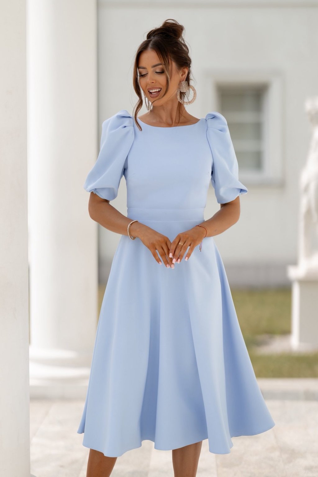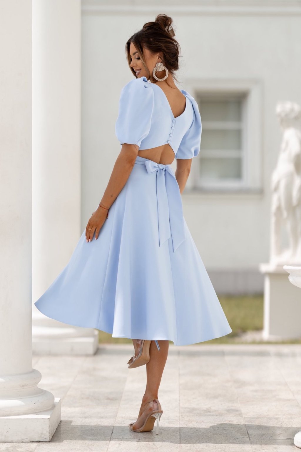 Světle modré midi šaty s odhalenými zády