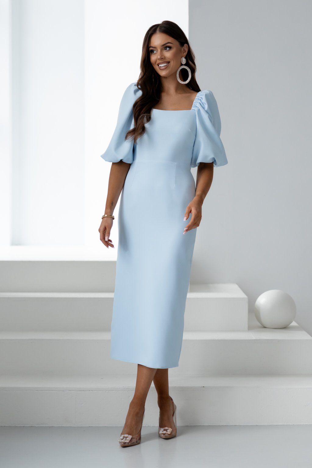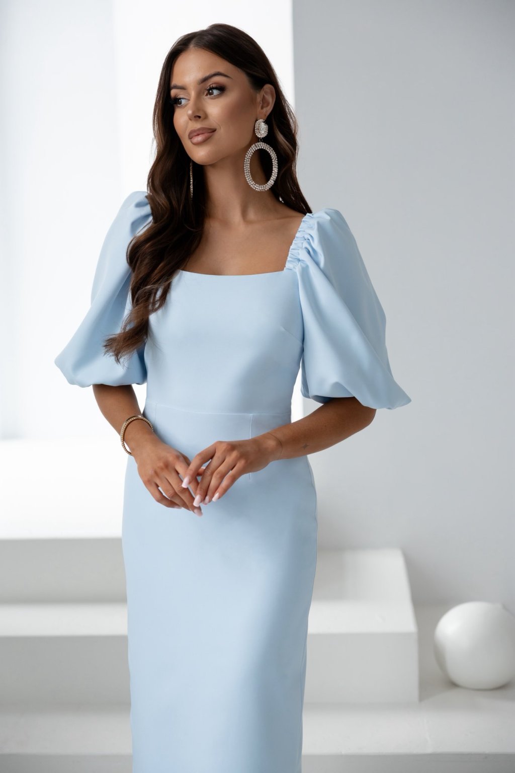 Světle modré přiléhavé midi šaty s balónovými rukávy