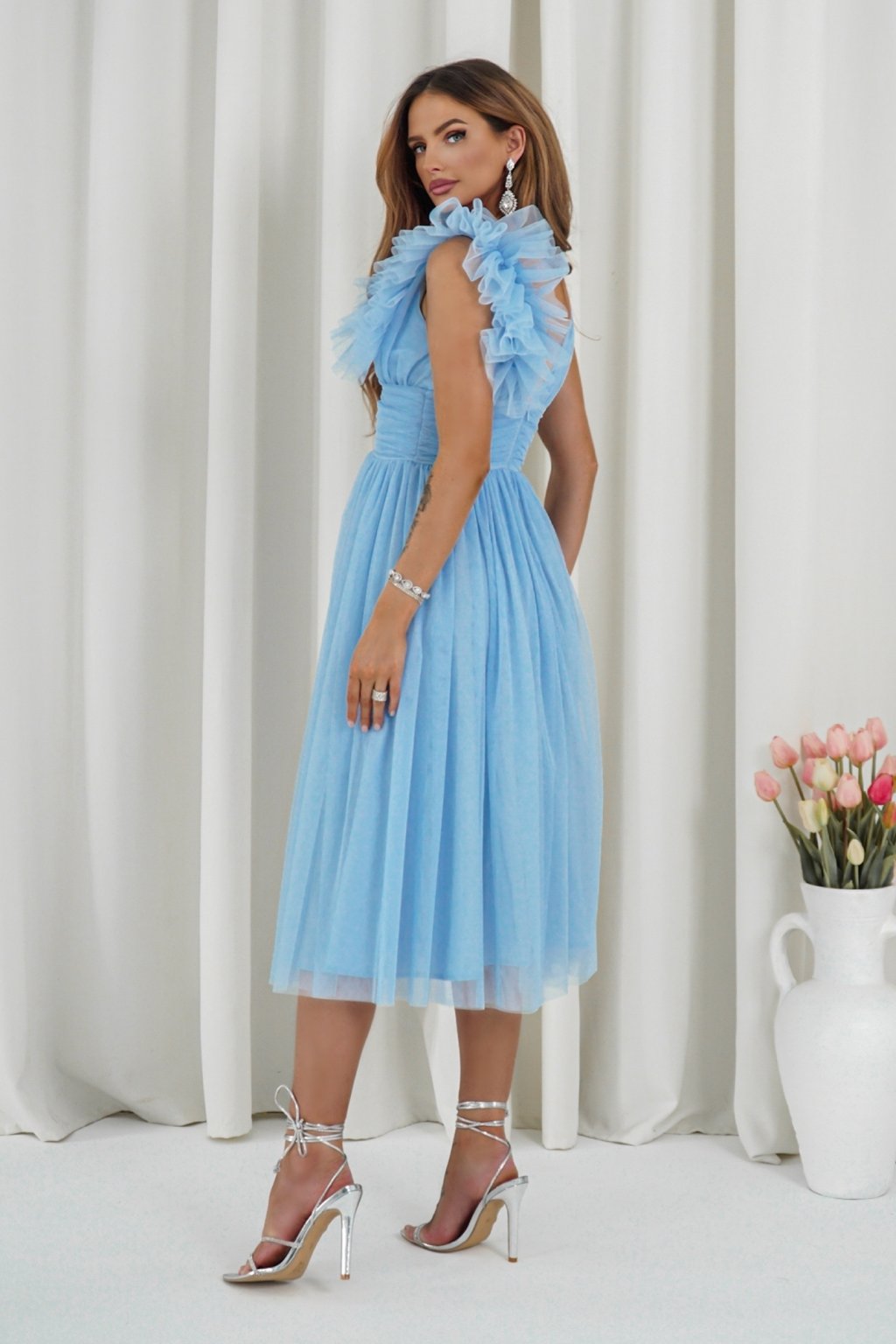 Tylové šaty v midi délce, které si zamilujete na první pohled. Do minantním prvkem je bohatě nařasený tyl na rameni , který dodává šatům originální a elegantní vzhled. V těchto šatech se budete cítit sebevědomě, pohodlně a nezapomenutelně. Stačí jen jemné doplňky a úsměv – o zbytek se postarají tyto šaty.