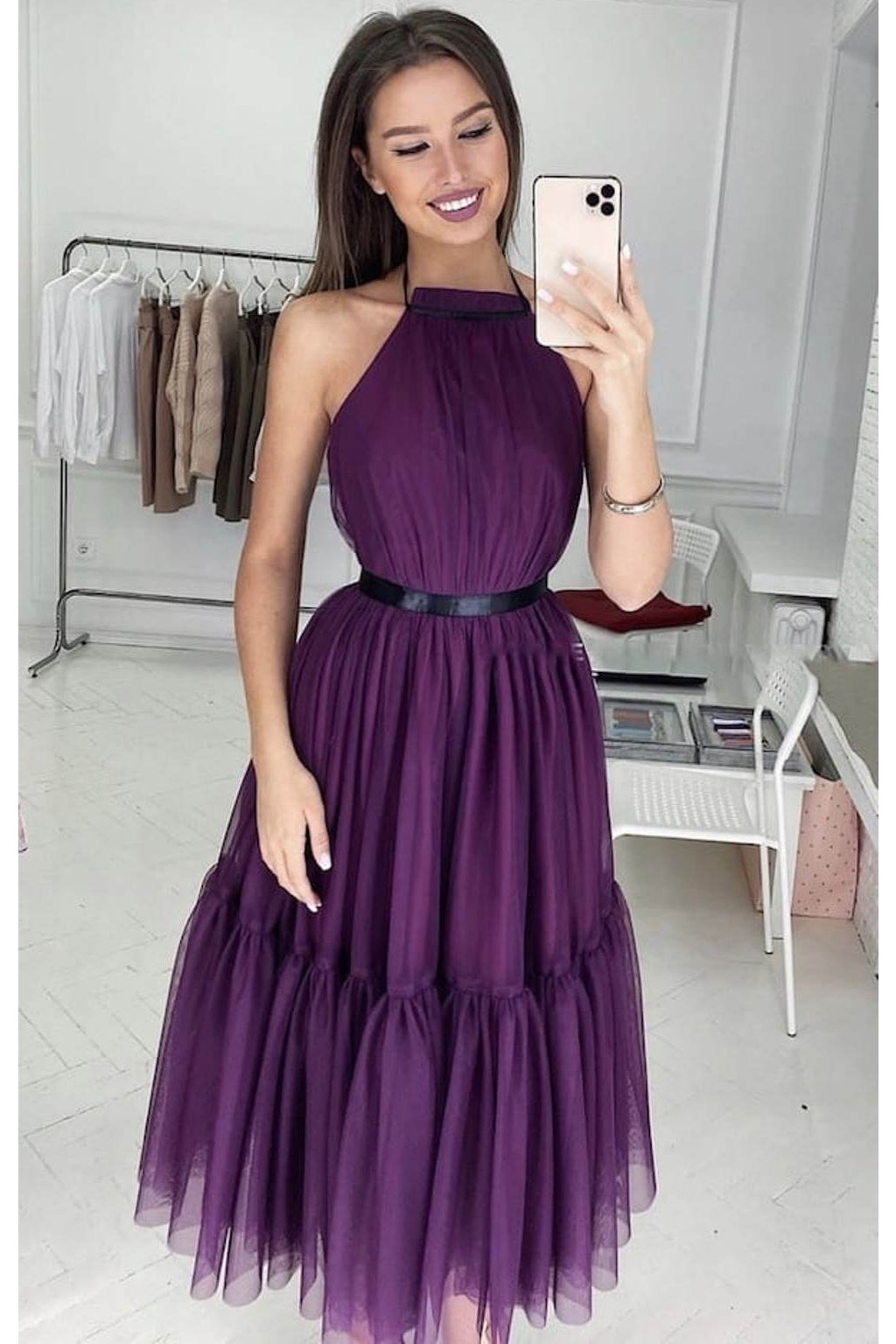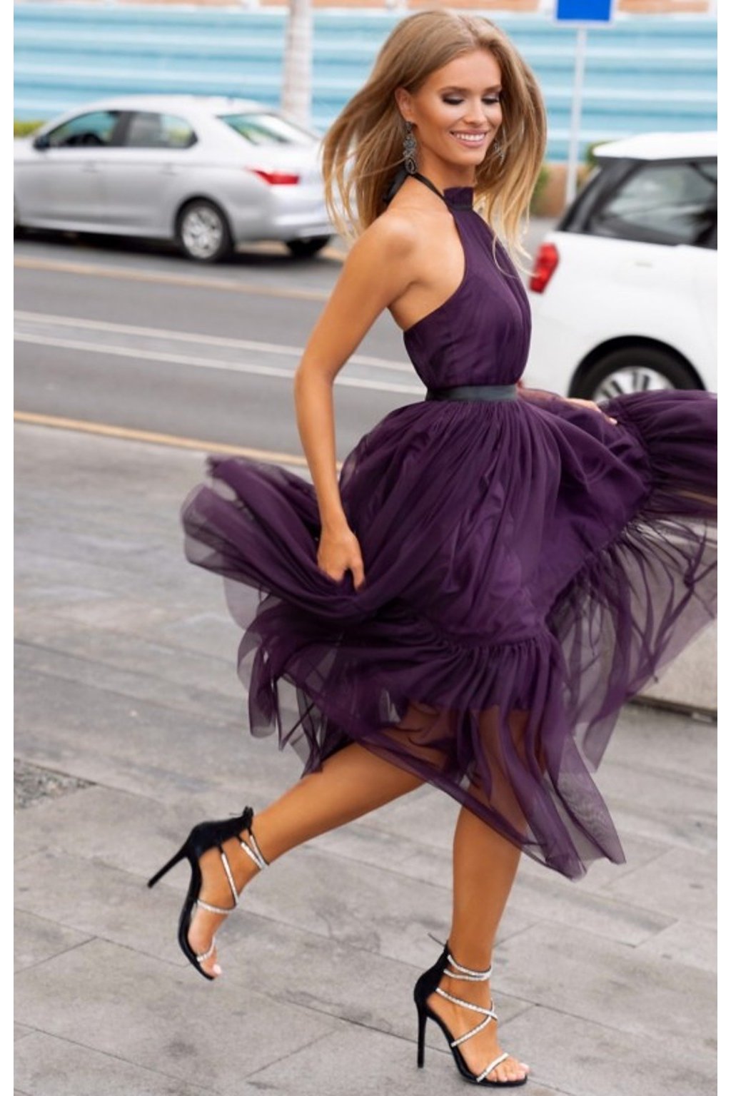 Tmavě fialové tylové midi šaty