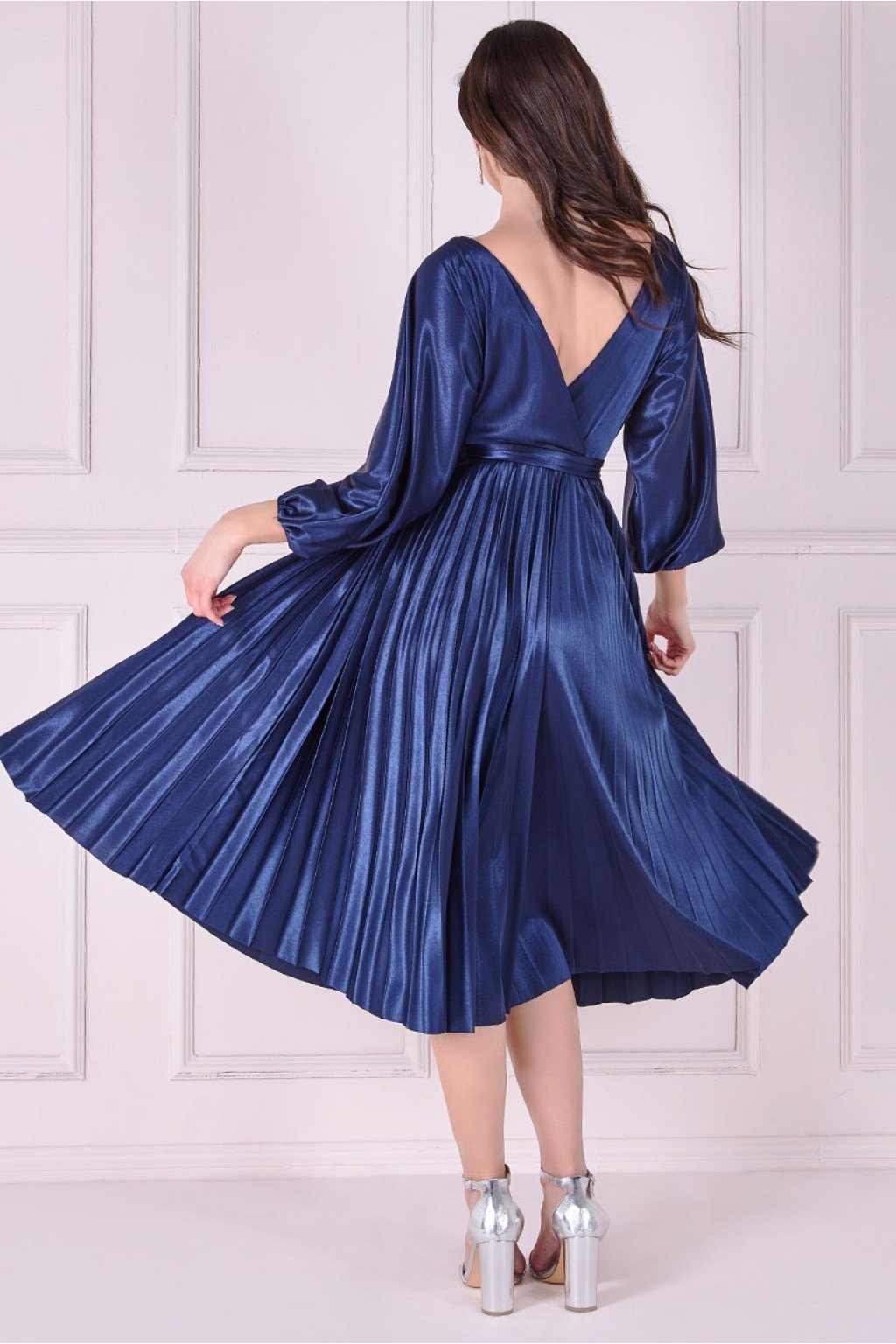 Tmavě modré lesklé midi šaty s plisovanou sukní