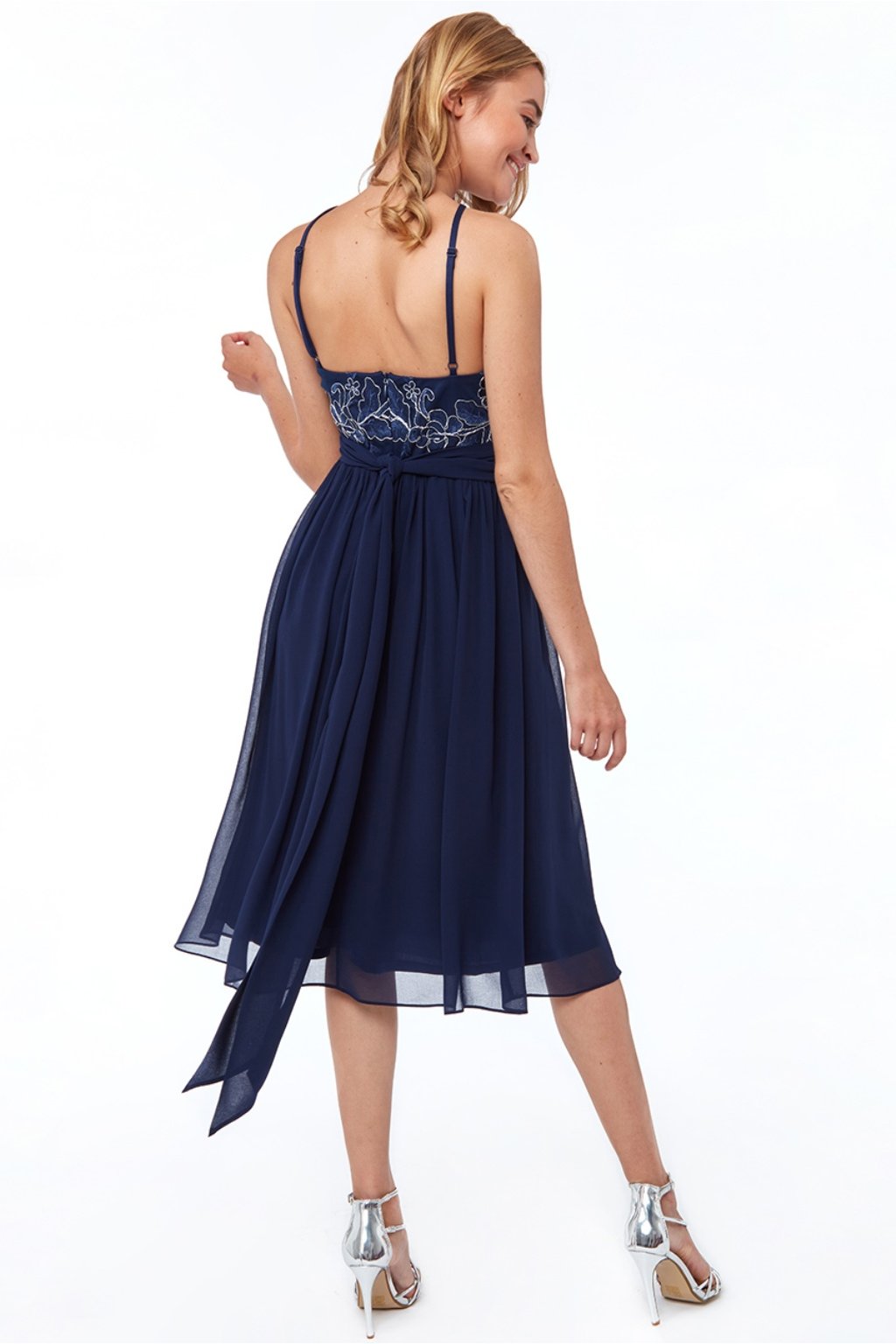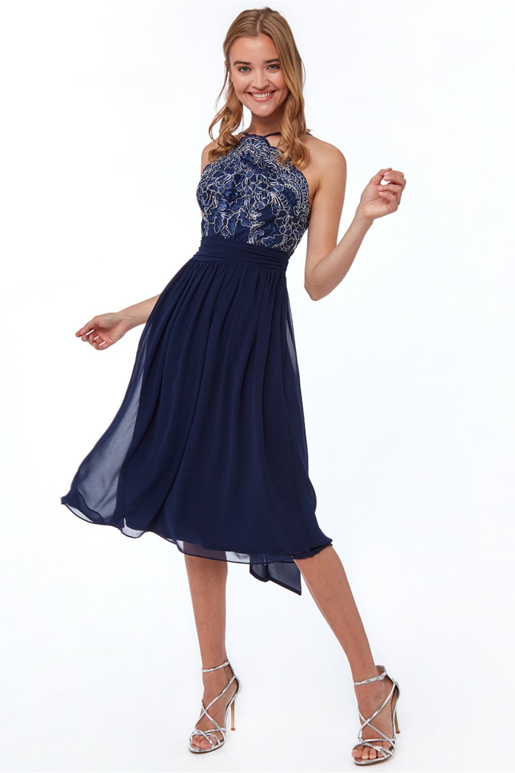 Tmavě modré šifónové midi šaty s krajkou