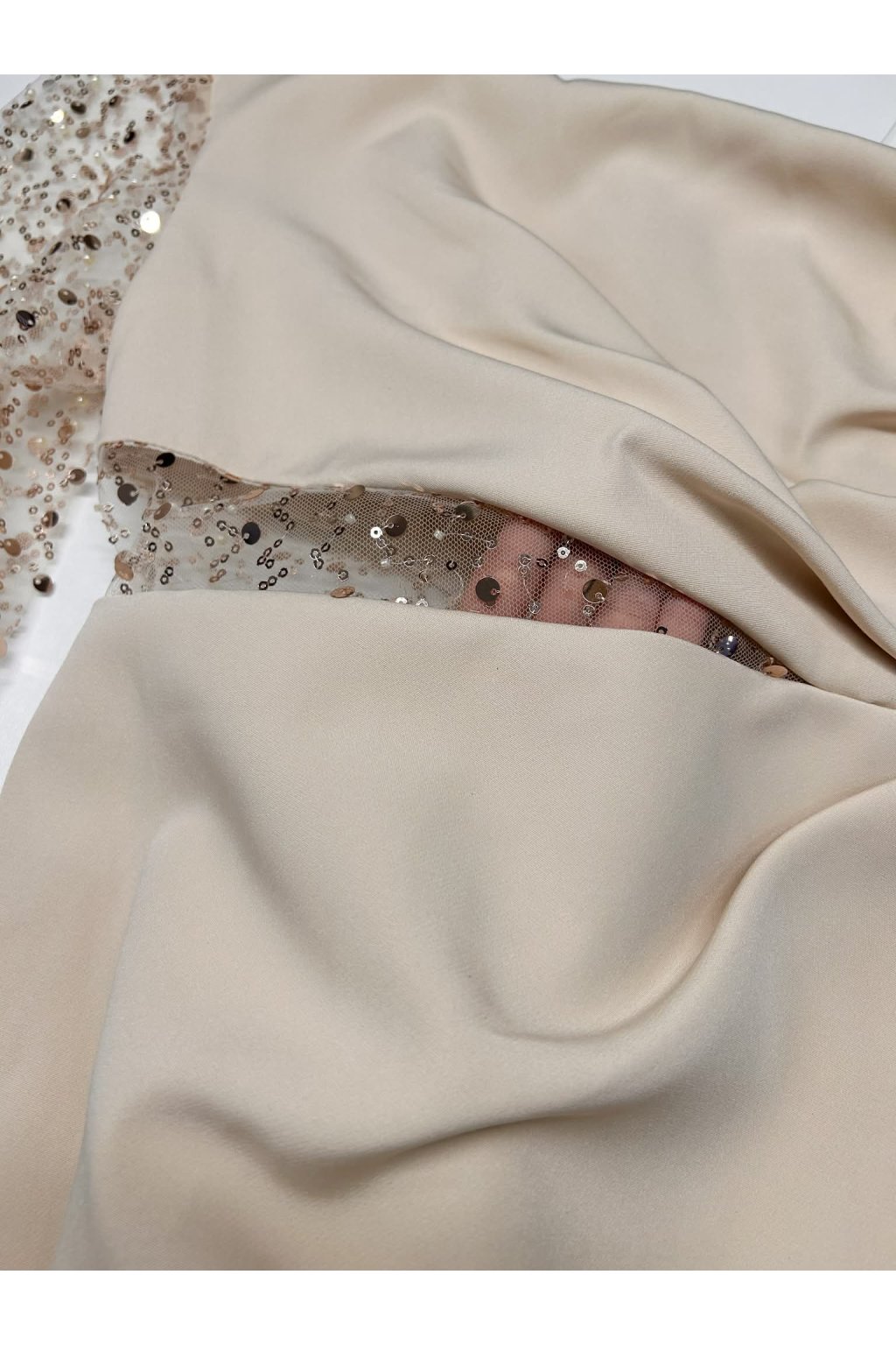 Poškozené zboží - Béžové krátké šaty se třpytivým rukávem