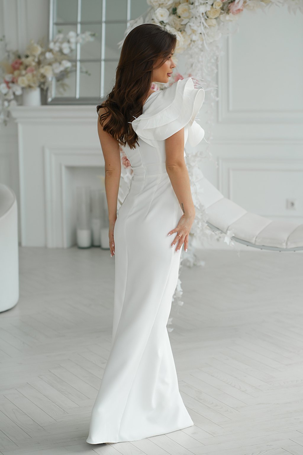 Mohutný volán lemující rameno na sebe strhne každý pohled a vy budete elegantní, šarmantní a pro ženicha nezapomenutelná nevěsta. Materiál šatů je mírně elastický a vzadu se zapínají zipem.